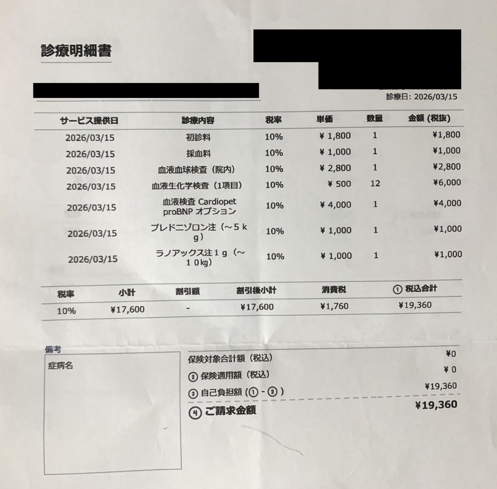 動物病院を受診し、最初は心臓が原因の可能性もあると言われましたが、血液検査の結果、大きな異常は見られませんでした。