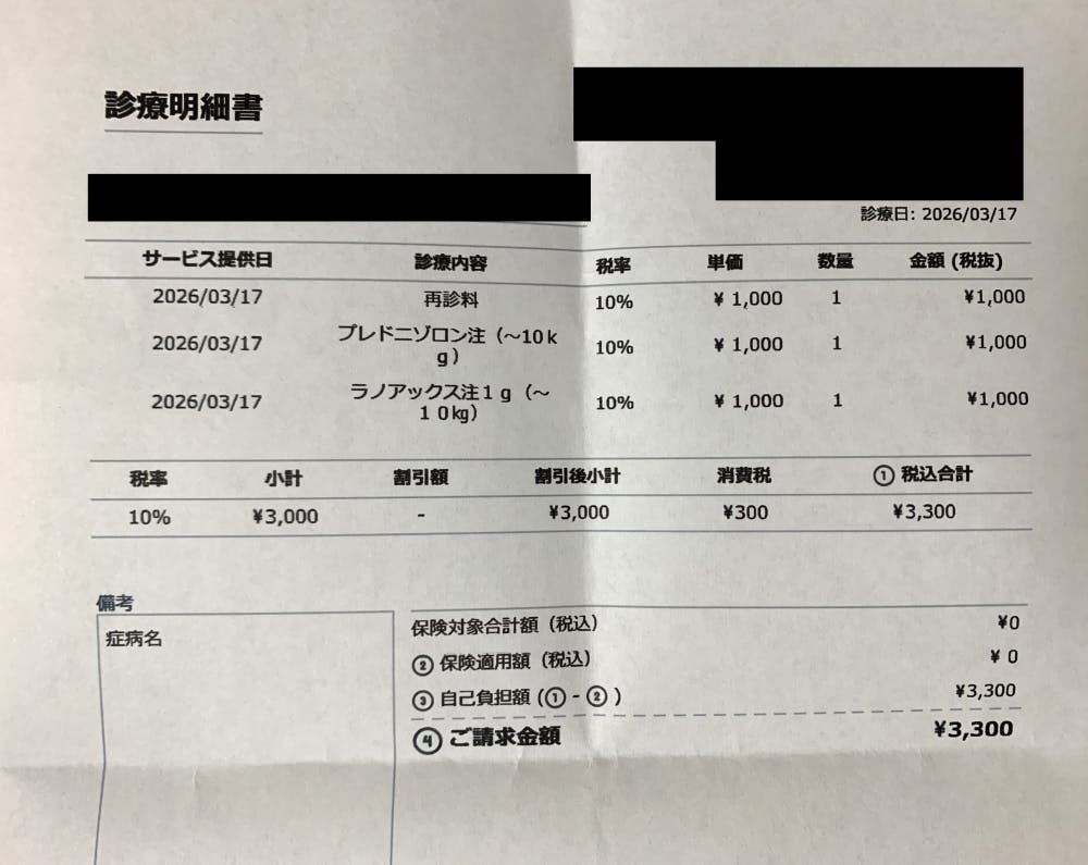 前日まで元気に過ごしていた中での出来事に、戸惑いと不安を感じすぐに動物病院へ向かいました。