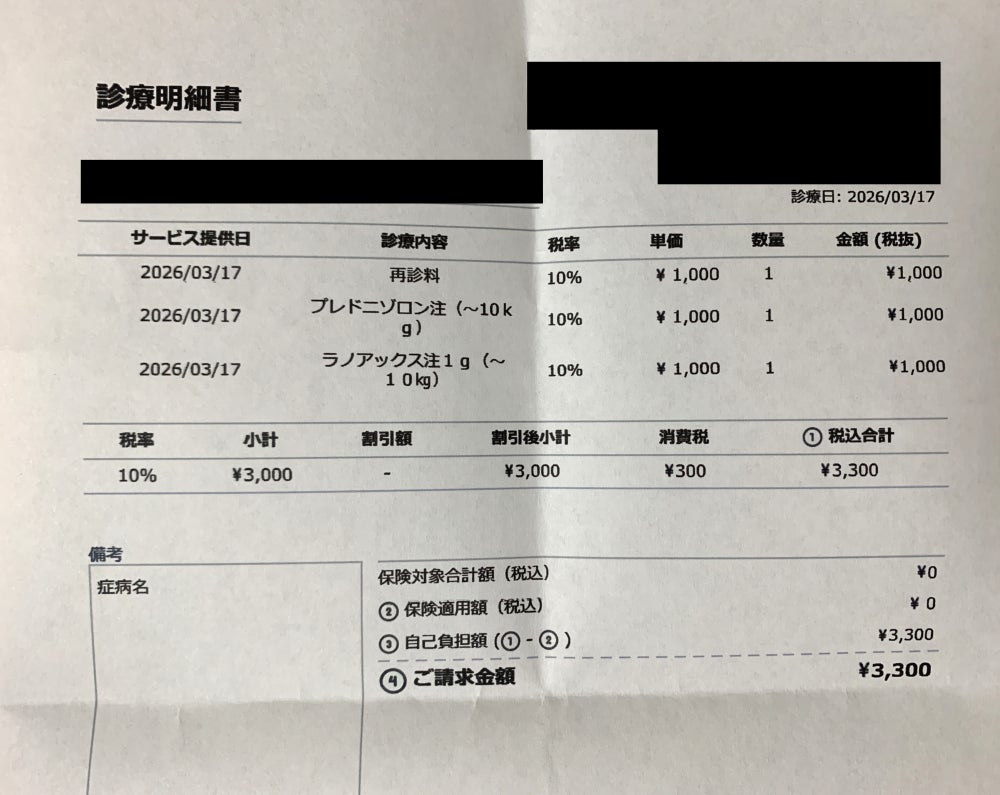 3月17日の診療明細書現在は、麻痺の改善を目的とした注射をしていただいています。