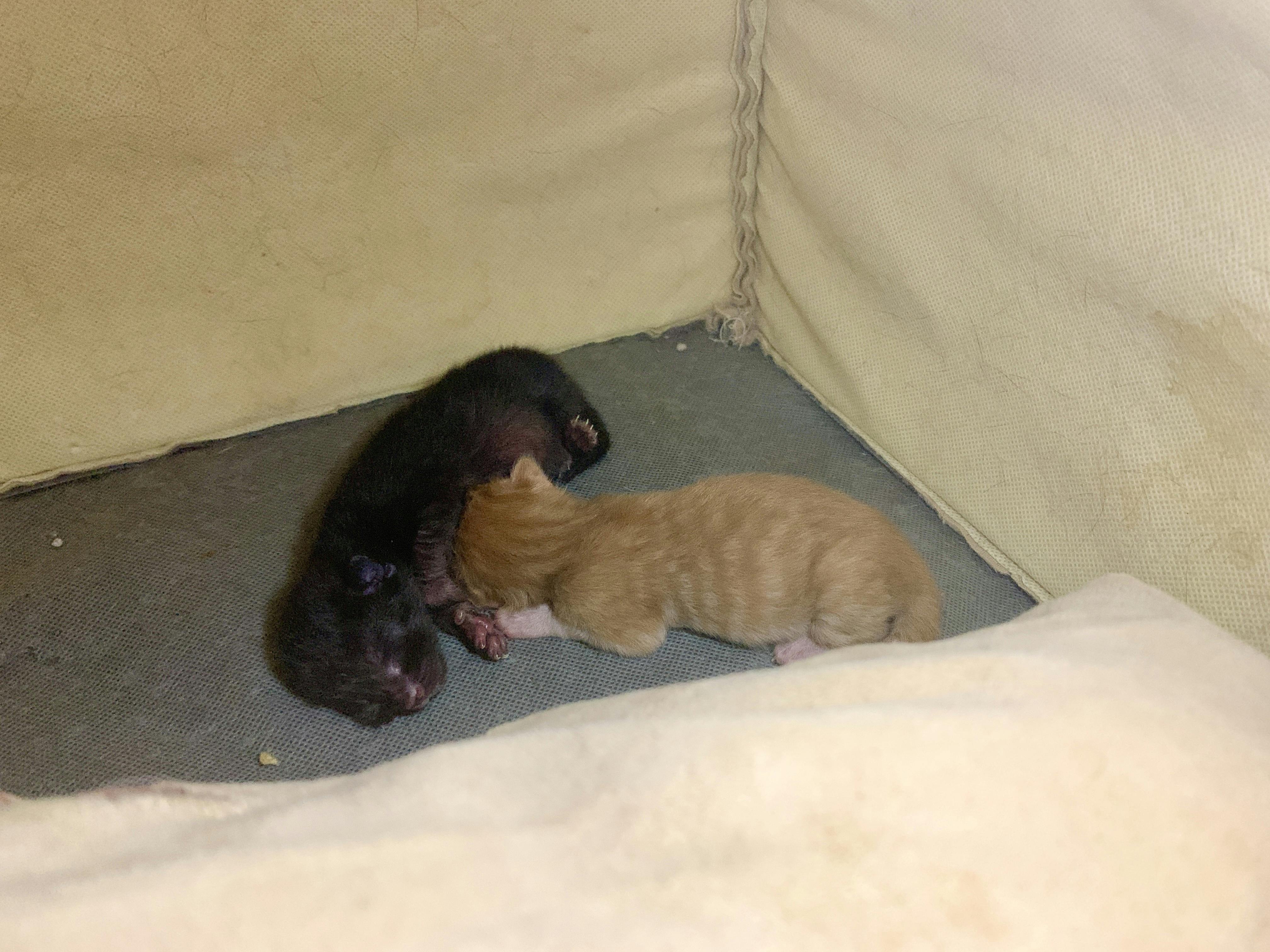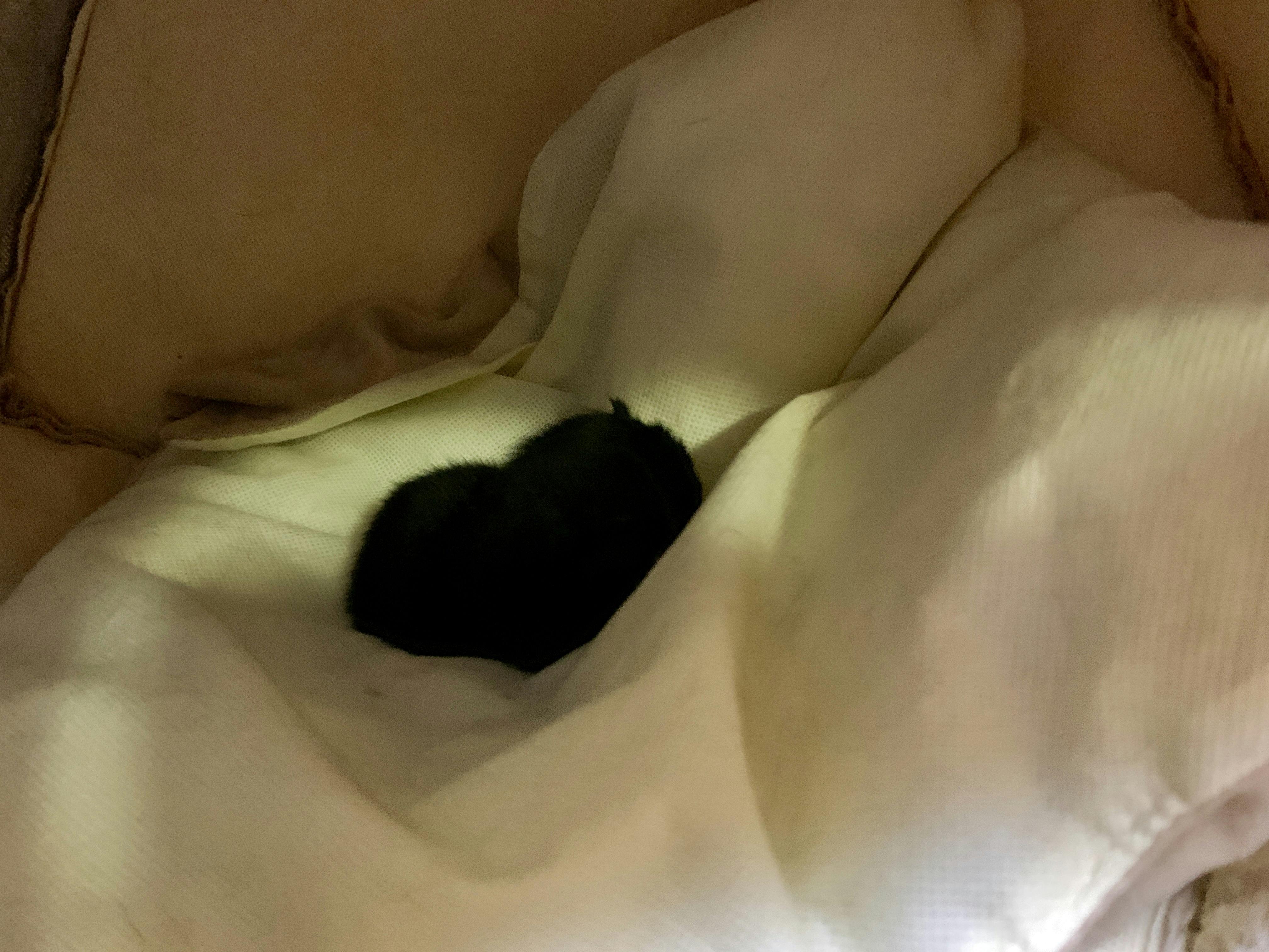 このクラウドファンディングのきっかけとなった花ちゃんの出産のこともあり、他にもいないかと部屋中を探したところ、ケージの中のかまくらにもう1匹黒い子猫がいました。