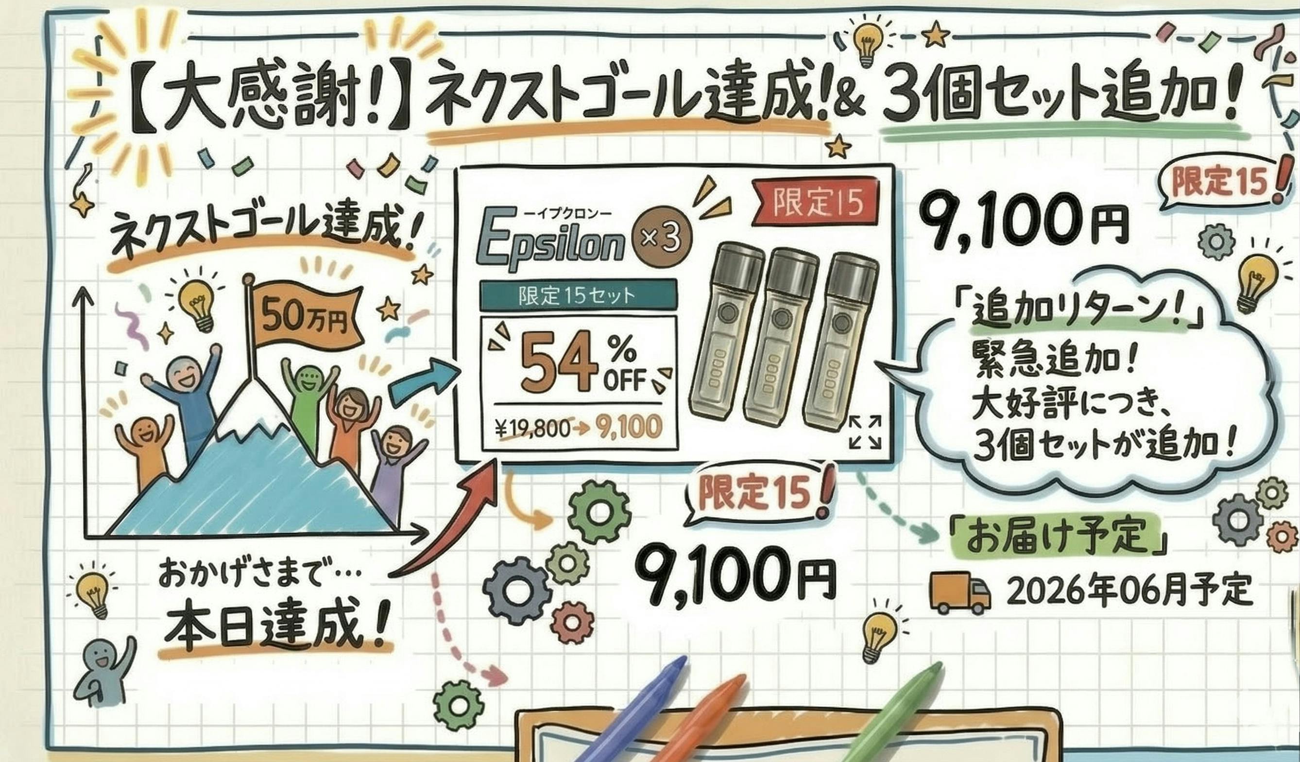 2026/03/11 13:32昨日15時にスタートしたばかりの「Epsilon(イプシロン)」ですが、おかげさまで、開始から24時間で目標金額を達成することができました!正直なところ、公開するまでは「ちゃんと受け入れてもらえるかな……」とドキドキしていたのですが、初日からこんなにたくさんの方に応援をいただけて、チームみんなでホッとしています。本当にありがとうございます。ここで現在のリターン状況を少し共有させてください。ありがたいことに、以下のプランが完売となりました。・最速割 55%OFF(2個セット)・CAMP割り 32%OFF(1個)現在は、2個セットで次にお得な「早割 54%OFF」が残り少なくなってきています。もしご家族やご友人へのプレゼントとして迷われている方がいらっしゃれば、早めにチェックしてみてくださいね。目標は達成しましたが、プロジェクトはまだ始まったばかりです。せっかくいただいたこの勢いを大切にしたいので、次の目標を500,000円に設定して、もっとたくさんの方に知ってもらえるよう頑張ります!55gという軽さや、800ルーメンの明るさ、サイドライトの多彩な機能など、このライトの「使ってみて楽しいポイント」も、これから少しずつ紹介していこうと思います。もしよかったら、SNSなどでこのページを広めていただけると、とても大きな励みになります!プロジェクトページはこちら↓https://camp-fire.jp/projects/926858/viewこれからも、Epsilonをどうぞよろしくお願いいたします。 もっと見る