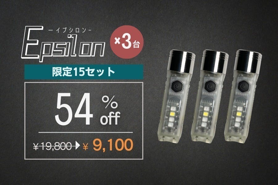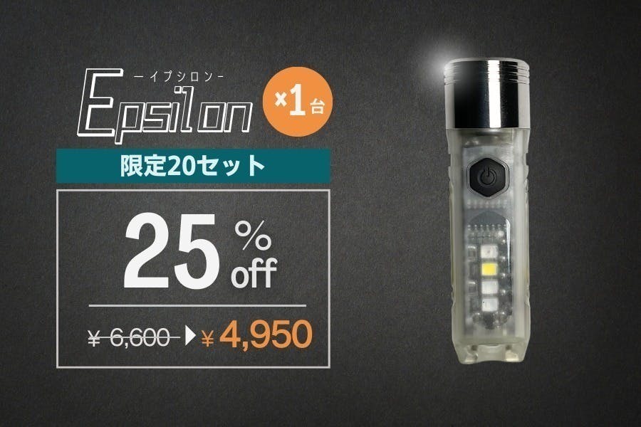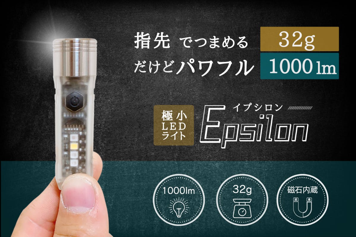 指で摘まめる極小サイズと1000lmという高出力を両立する「EPSILON(イプシロン)」は強力マグネットと一体化しており、肌身離さず持ち歩くことができます。いつもあなたのそばにいる最高の相棒として頂くことを期待しています。精一杯プロジェクトに取り組んで参りますので、どうかよろしくお願いいたします。