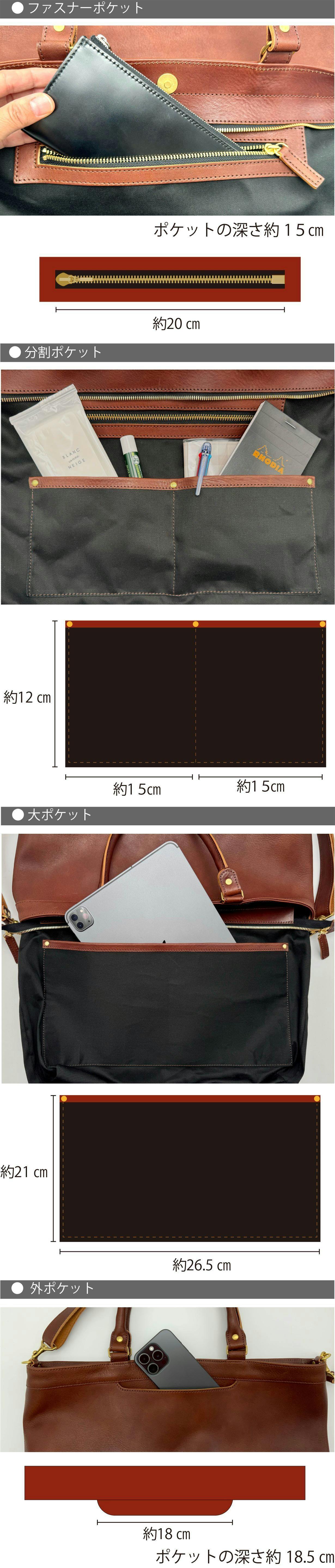 ポケットは4種類のポケットを完備。・大事なものをしまうファスナーポケット・スマホ、名刺ケース、メモ用紙がしまえる分割ポケット・iPadを仕舞えるクッション入り大ポケット・サッと仕舞えて、サッと取り出せる外ポケット