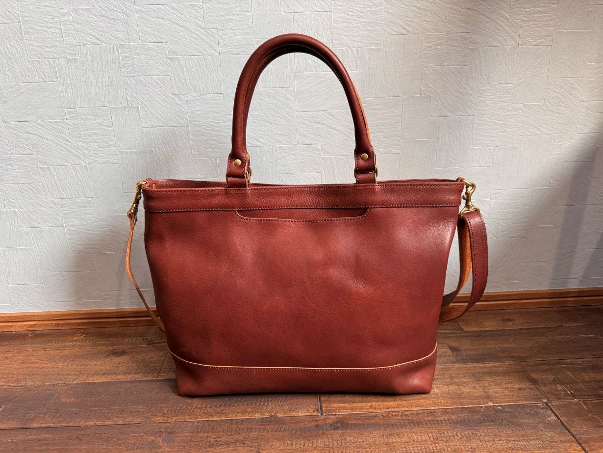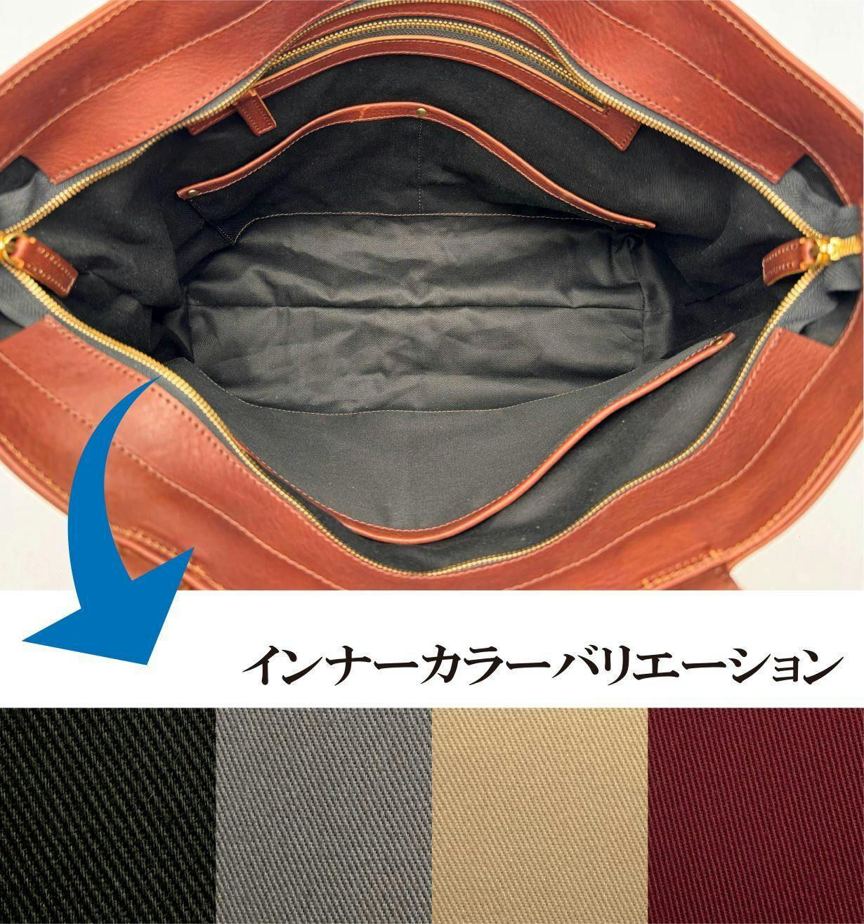 個性を感じられるよう、インナーカラーを4色から選べるようにしました。エイジングと共に、更に愛着の湧くトートバッグに。