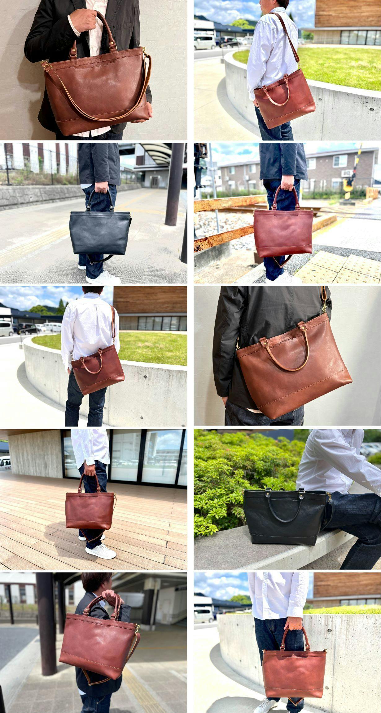 持ち手の長さは、ぎりぎり男性(標準体系)が肩に掛けれるサイズにしています。持ち手が長すぎるとショルダーにした時にバランスが悪いので、持ち手を使わない時もカッコイイ絶妙なバランスにしました。