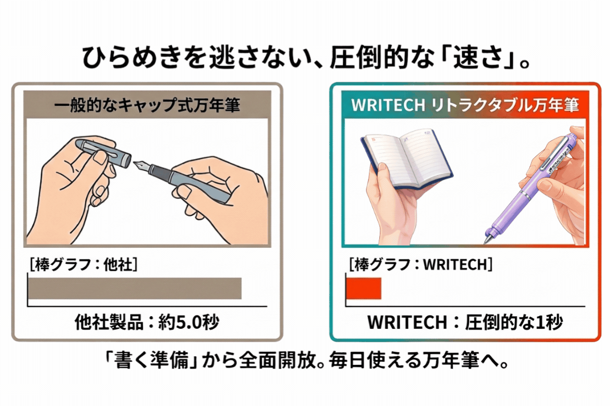 私がこの WRITECH リトラータブル万年筆 に出会ったとき、目から鱗が落ちる思いでした 。ノック1秒。カチッという心地よい音とともに現れるペン先。特許取得の「ハッチ密閉方式」によって、いつでも、どこでも、最初の一画目から最高の書き味を約束してくれる安心感 。これはもはや、単なる趣味道具ではなく、現代を生きる私たちの思考を加速させるための「最強の武器」だと確信しました 。