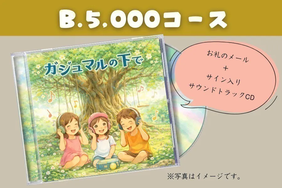CDには、テーマ曲『がじゅまるの花』をはじめ、劇中で使用された楽曲を収録予定です。また、比嘉太郎の生涯や村民劇について詳しく記載したパンフレットが同封されたコースもございます。