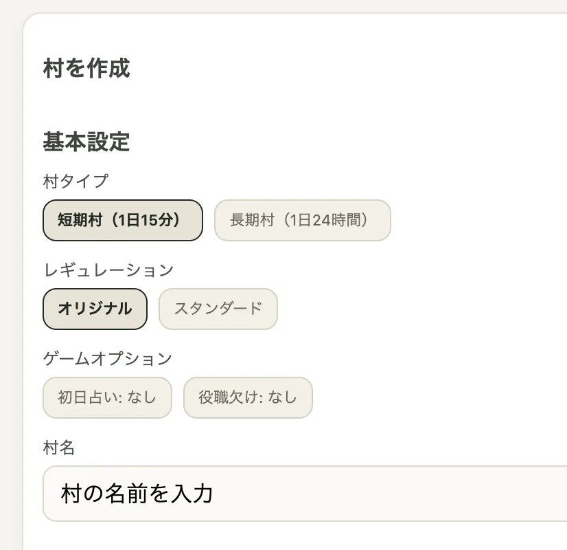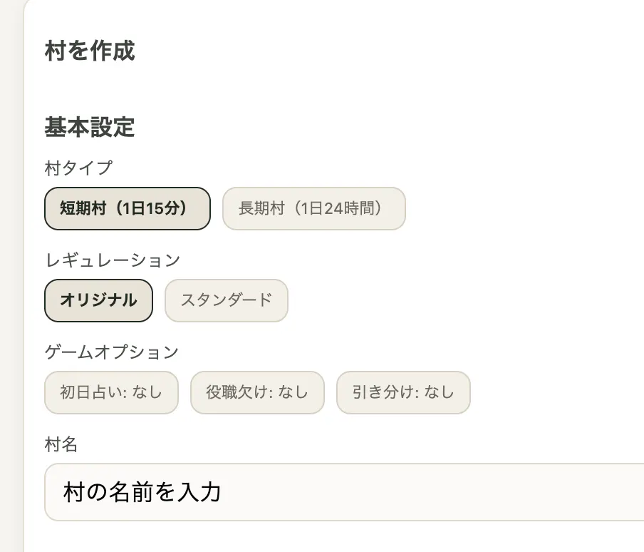 2026/03/14 20:02いつもご支援ありがとうございます。開発の進捗をご報告いたします。追加機能:・配役プリセット(村作成時に定番の配役構成を選択可能)村作成時にあらかじめ用意された定番の配役構成をプリセットから選択できるようになりました。遊びたい配役をすぐに設定でき、村立てがよりスムーズになります。現在はまだ開発段階のため本番運用には至っておりませんが、リリースに向けて引き続き開発を進めてまいります。今後ともご支援・応援のほど、よろしくお願いいたします。 もっと見る