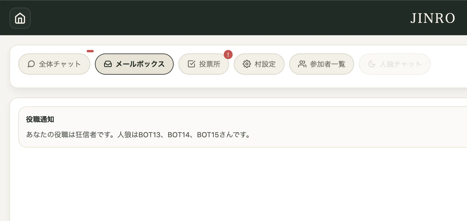 いつもご支援ありがとうございます。開発の進捗をご報告いたします。追加役職:・狂信者(人狼陣営。人狼が誰かを知ることができる狂人の上位役職)狂信者は通常の狂人と同じく人狼陣営ですが、ゲーム開始時に人狼が誰かを把握した状態でプレイできます。確実に人狼と連携が取れるため、より精度の高い騙りや誘導が可能になります。現在はまだ開発段階のため本番運用には至っておりませんが、リリースに向けて引き続き開発を進めてまいります。今後ともご支援・応援のほど、よろしくお願いいたします。