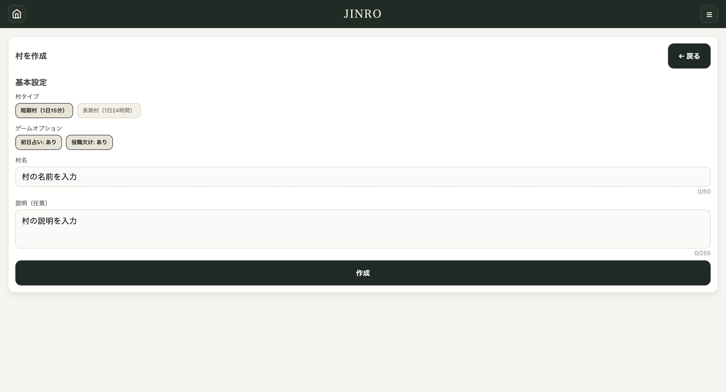 いつもご支援ありがとうございます。開発の進捗をご報告いたします。追加機能:・パスワード機能(村の作成時にパスワードを設定可能)パスワードを設定することで、特定のメンバーだけが入村できるプライベートな村を作成できます。身内同士で遊びたい場合などにご活用いただけます。現在はまだ開発段階のため本番運用には至っておりませんが、リリースに向けて引き続き開発を進めてまいります。今後ともご支援・応援のほど、よろしくお願いいたします。