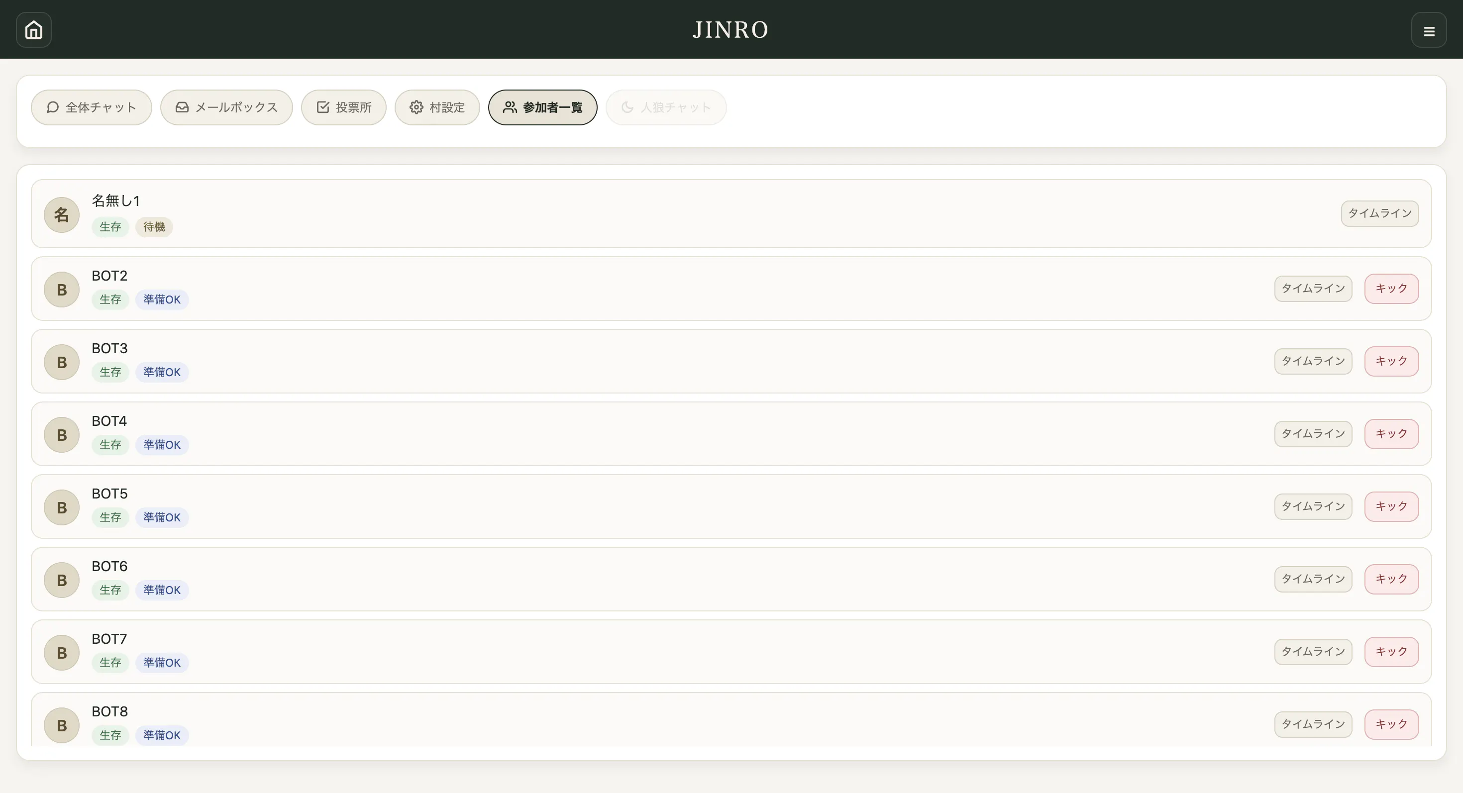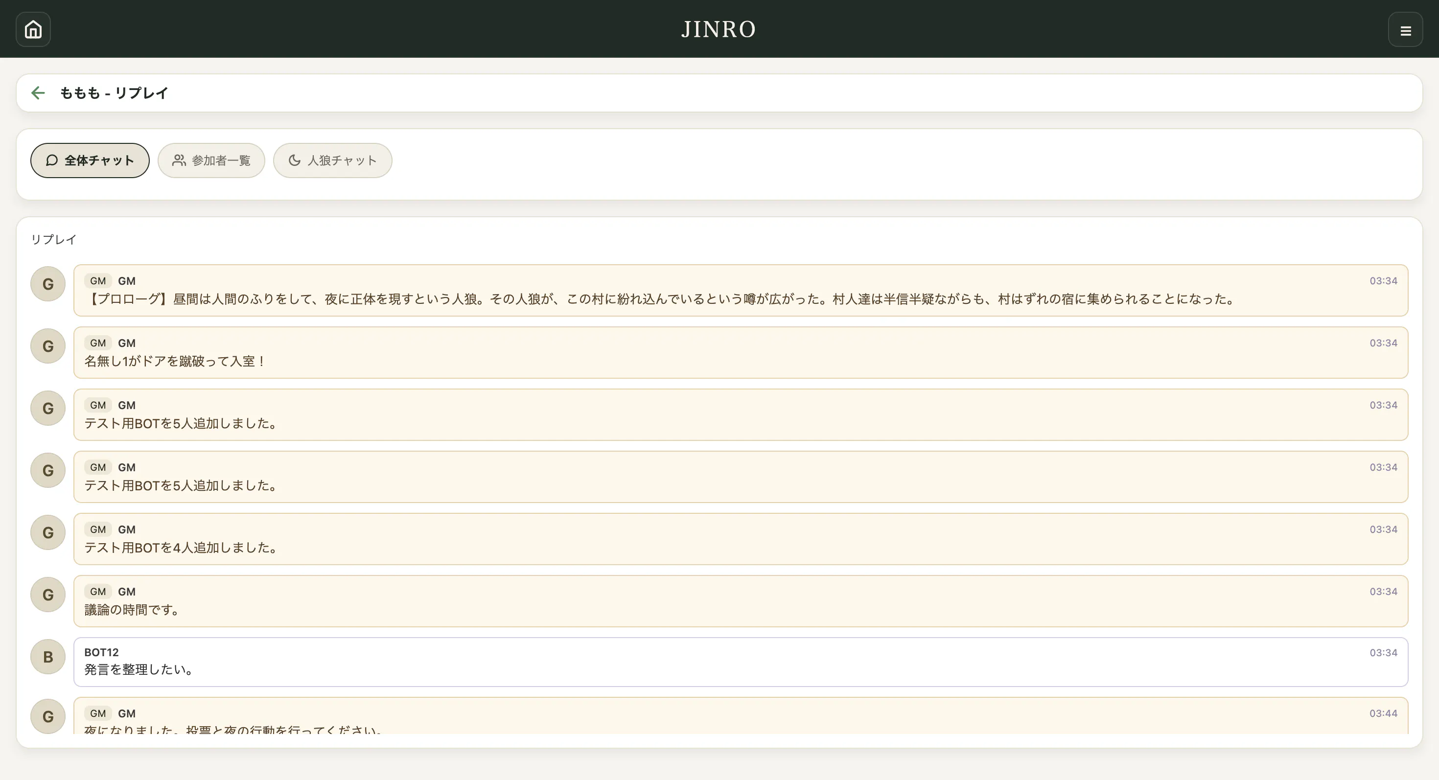 いつもご支援ありがとうございます。開発の進捗をご報告いたします。追加機能:・リプレイモード(終了した村のゲームログを閲覧可能)終了した村の発言や投票、役職情報などを振り返ることができます。自分のプレイの反省や、他プレイヤーの動きの研究にご活用いただけます。現在はまだ開発段階のため本番運用には至っておりませんが、リリースに向けて引き続き開発を進めてまいります。今後ともご支援・応援のほど、よろしくお願いいたします。