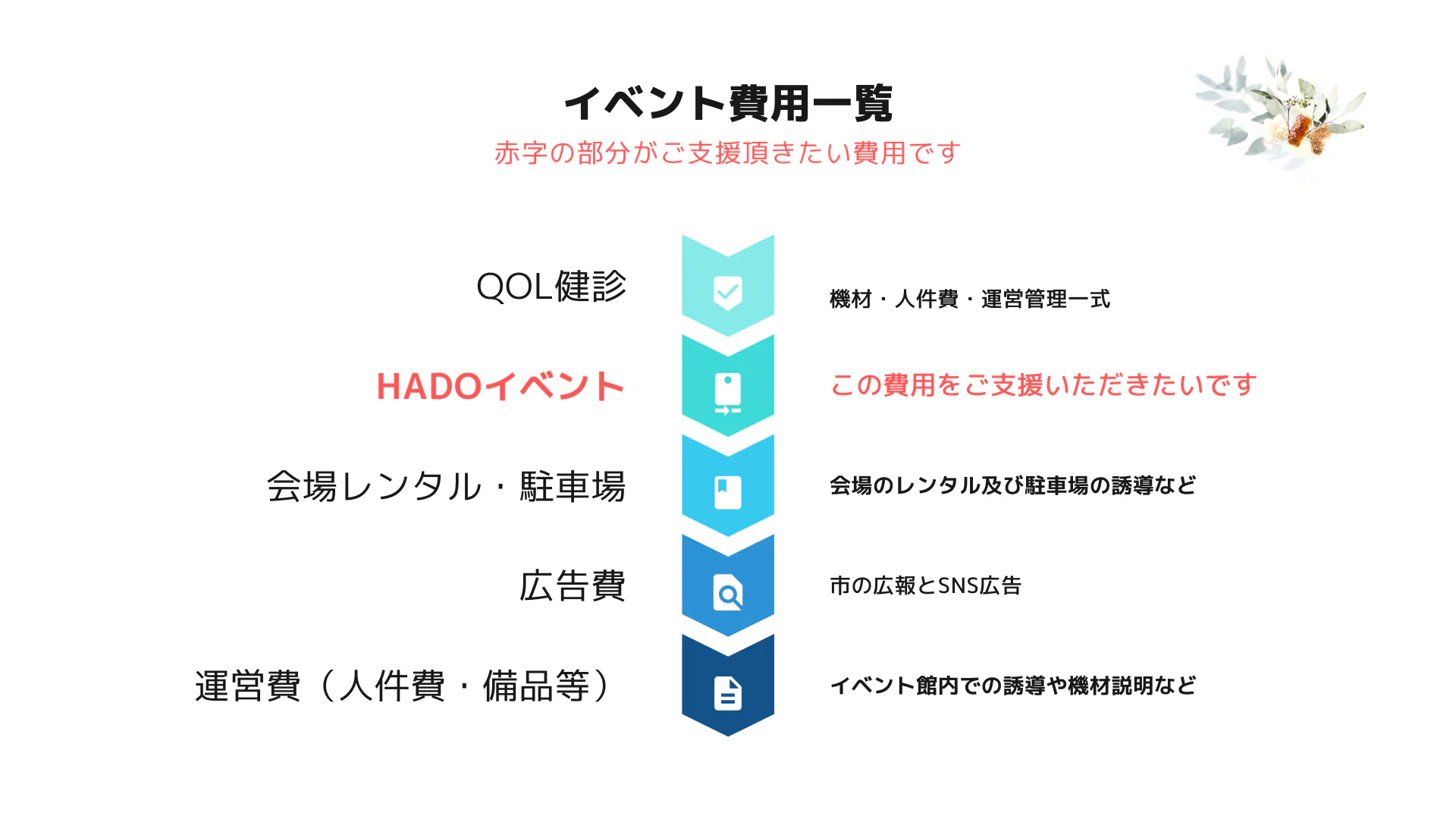 このイベントの二つの主力コンテンツとして、①QOL健診 ②次世代ARスポーツ「HADO」があり、小さいお子様から中高年代まで楽しんで参加して頂きたい。そして「ご自身又は身の回りの大切な人の健康」について考えるきっかけになる事を願いプロジェクトを立ち上げました。すでに協賛を頂いていますが資金が不足している状態でございます。