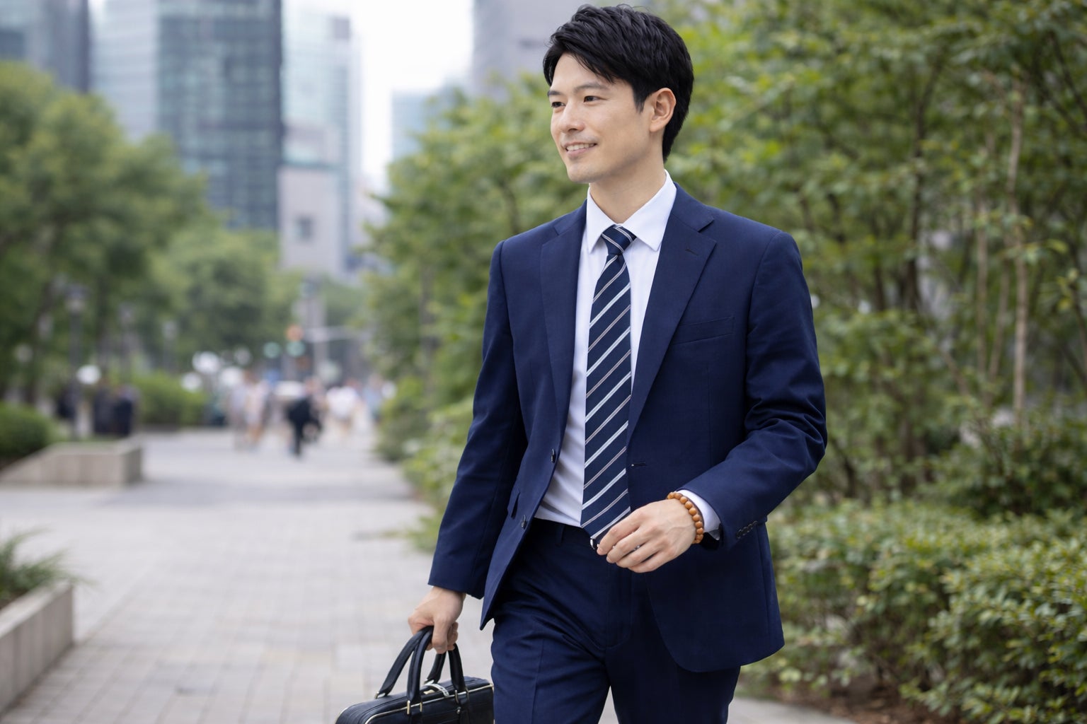 スーツスタイルの手元に穏やかなアクセントを加え、