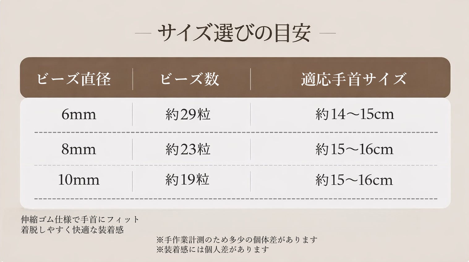 細めのビーズサイズで、さりげなく手元に馴染む印象。