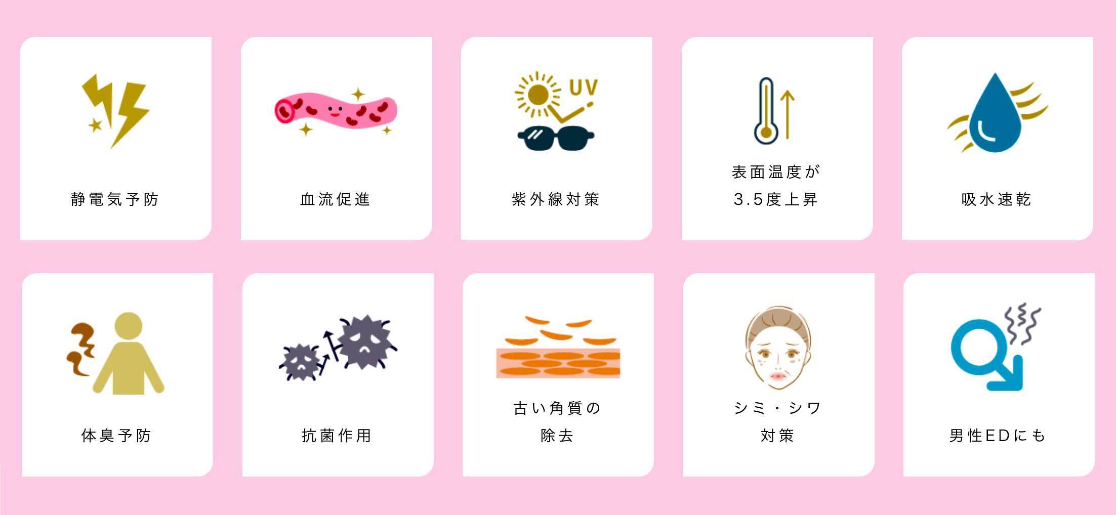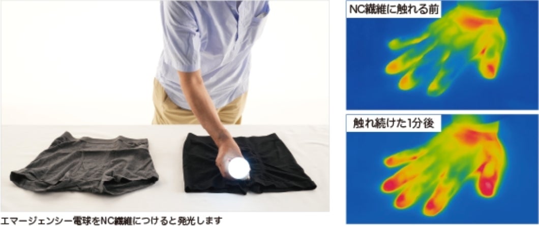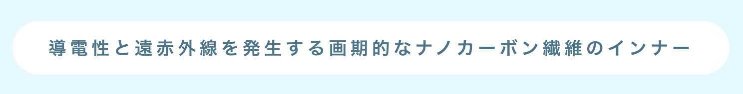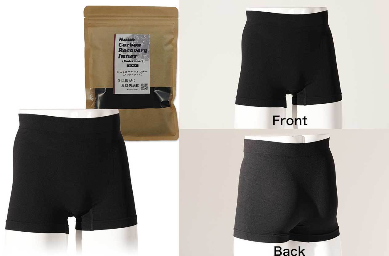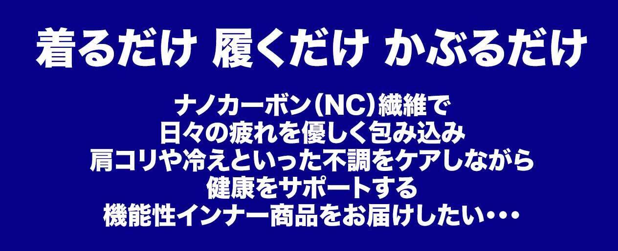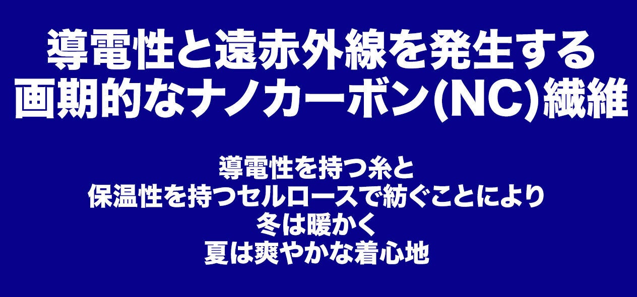 この繊維は導電性を持つ糸と、保温性を持つセルロースで紡ぐことにより、冬は暖かく、夏は爽やかな着心地となります。遠赤外線は、光と電磁波でできています。この遠赤外線の光は命の源です。遠赤外線の電磁波はエネルギー値が高く、身体の代謝を上げ、様々な影響を与えてくれます。動植物は全て、生体電位により動いたり考えたりしながら生命を保っています。このナノカーボン繊維が持つ導電性は、その生体電位を増幅させるためパフォーマンスが活発化するのです。腰は身体の要です。「NC リカバリーインナー(アンダーウェア)」を身につけることにより、パフォーマンスの向上、新陳代謝の向上、膝や関節痛などの回復に役立ちます。