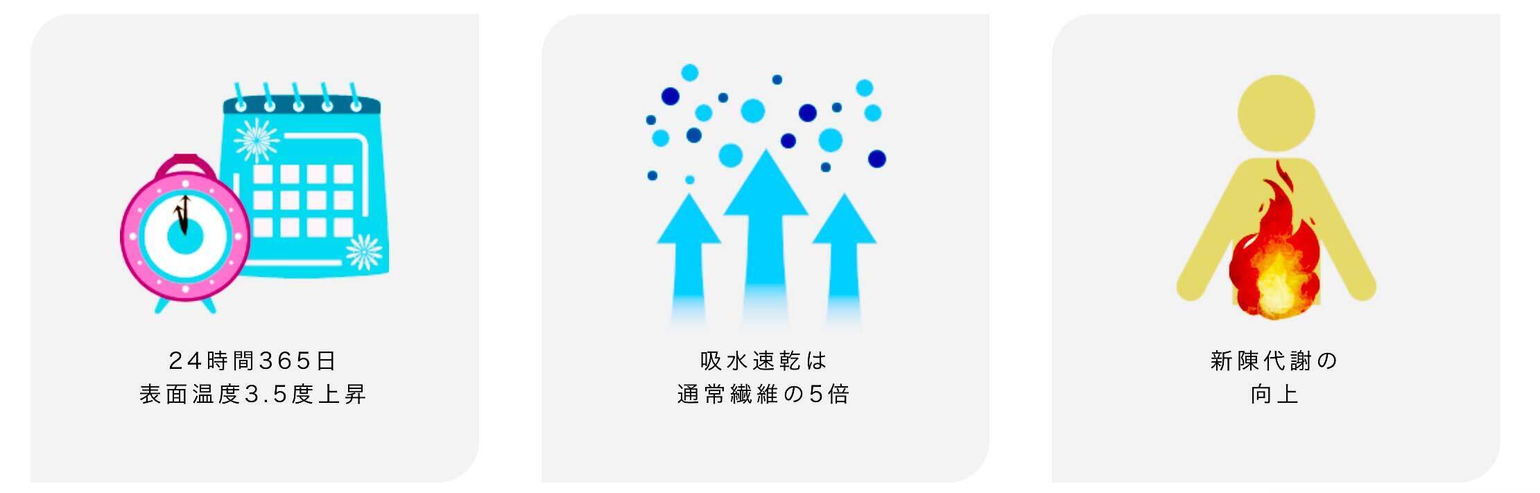 現代の多くの人々は、長時間の座り仕事やストレス、運動不足などにより血流が滞りやすくなっています。このNCリカバリーインナーでは、特殊なナノカーボン素材を使用しており、この素材の持つ遠赤外線放射効果によって血流を促進します。これは、ナノカーボン繊維自体に「導電性」があるため、身体が繊維の波長を捉え血液中の水分子が回転し、それによって血流をスムーズにし、血行をサポートします。