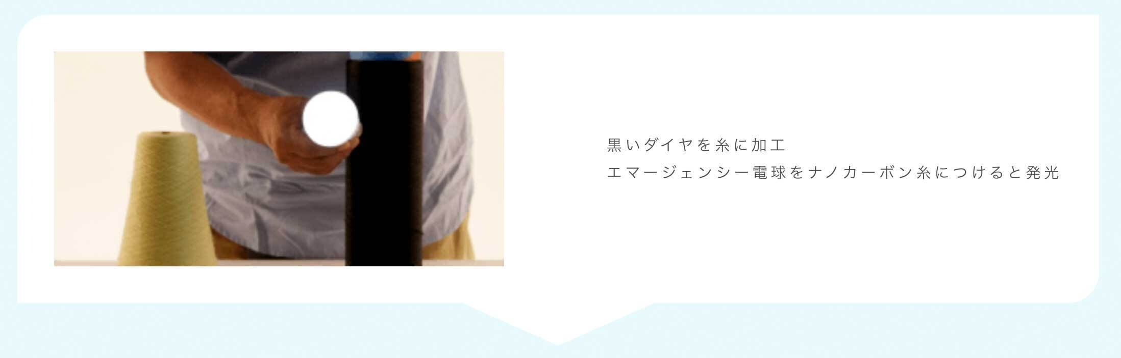 エマージェンシー電球をナノカーボン繊維につけると、繊維になっても発光します。