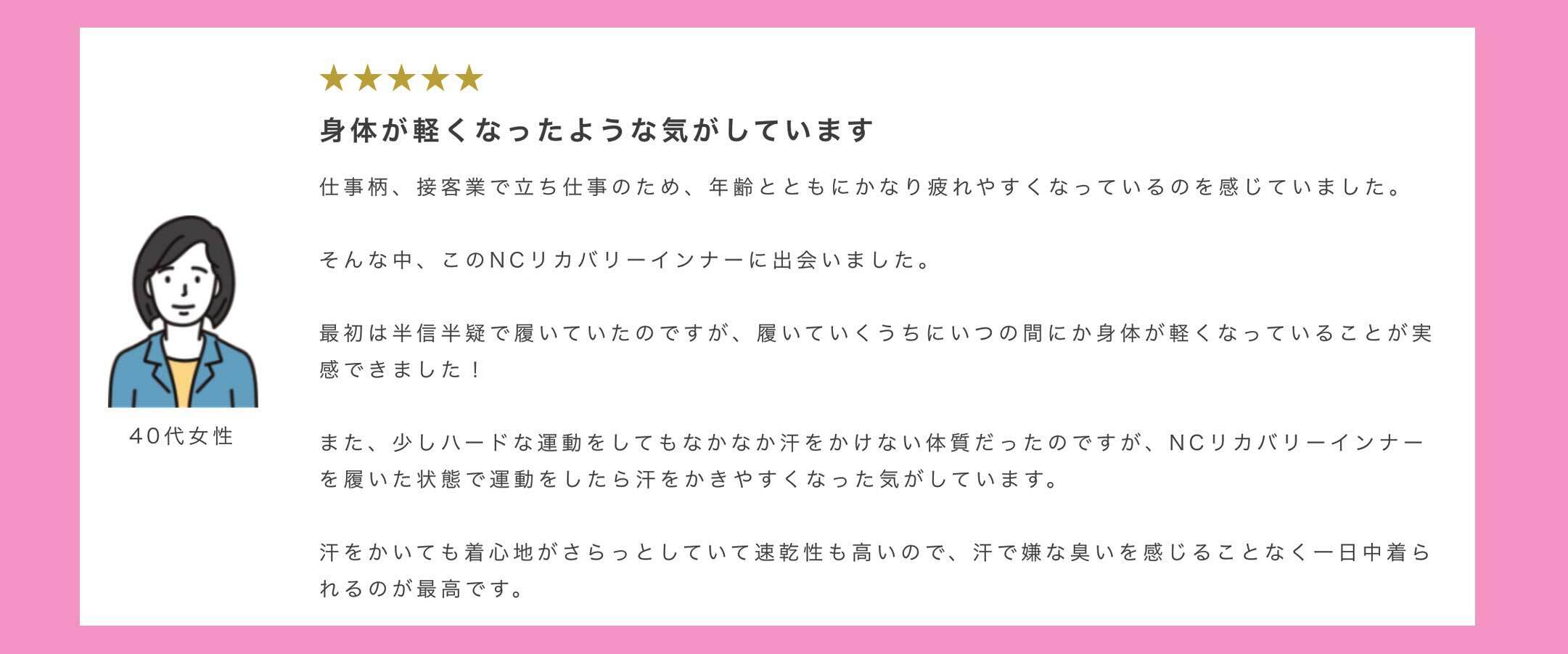 わたくしは40代後半女性です。関節痛や冷え性でもなく、身体がだるい日も全くない、健康体だと思います。だから特にリカバリーウェアを必要とも思っていませんでした。