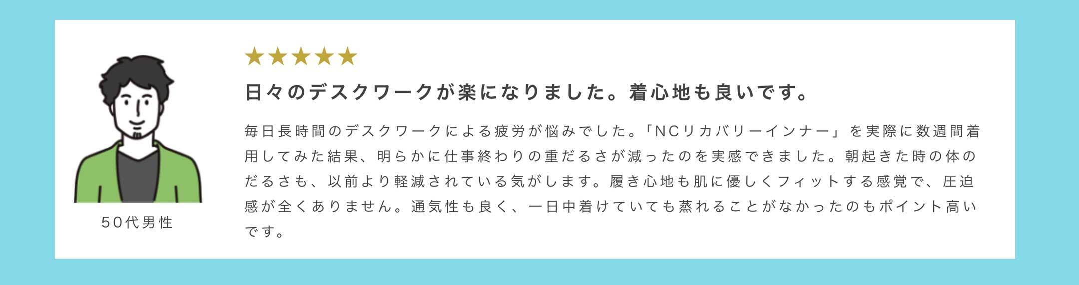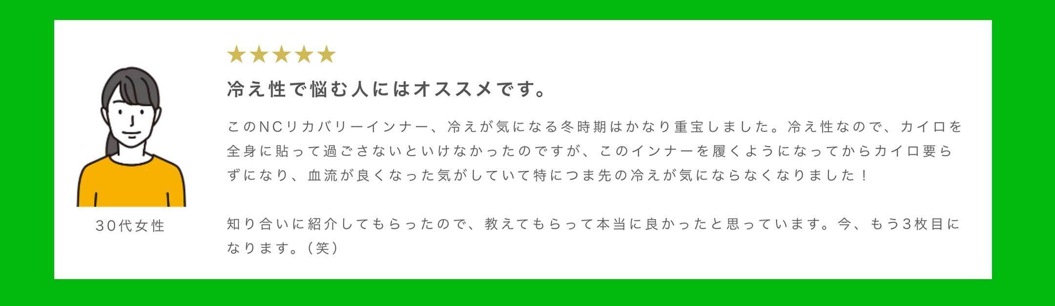 身体の冷えに負けない体作りをサポートするNCリカバリーインナーで、温活を始めませんか?NCリカバリーインナーは身体の表面温度を上げ、自然に体温を高めることができます。身体の冷えからくる不調は、寒い冬だけとは限りません。夏こそ冷房などによる冷えから身体に不調をきたすことが多くあるでしょう。つまり、「夏バテ対策」にも温活は効果的なのです。そのため、年中「冷え性」にお困りの方にもオールシーズンご愛用頂けます。また、体温調整機能を備えており、寒い日でも暖かく、暑い夏の日でもさわやかな着心地を実現します。疲れた体に優しく寄り添い、リラックスできる環境を作り出すことで、疲労回復を助け、エネルギッシュな毎日をサポートします。着るだけで体感できる快適さを、是非お試しください。NCリカバリーインナーは、最先端の技術を駆使して開発された高電位の高性能インナーです。身体を内側から温め、血行を促進することで、健康と美容の両面からサポートします。
