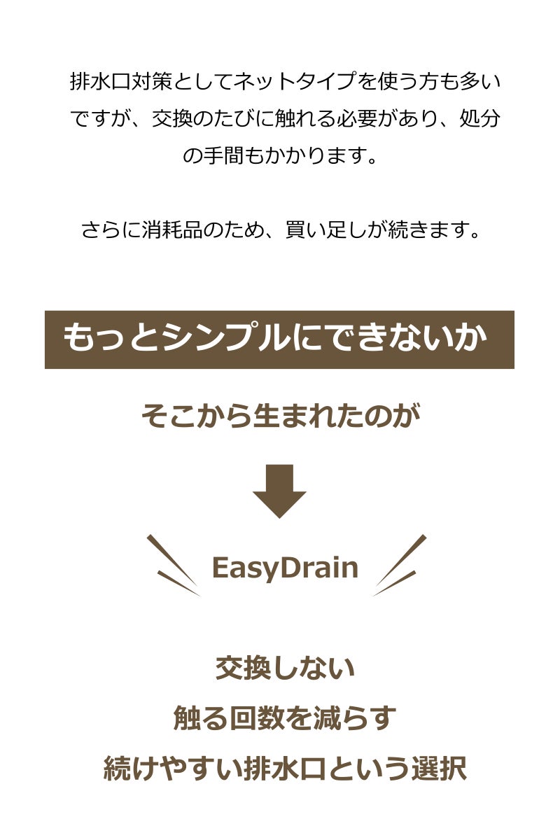排水口掃除でいちばん嫌なのは、髪の毛や汚れに直接触れる瞬間。EasyDrainは、その「触りたくない」を減らすために、処理方法をシンプルにしました。