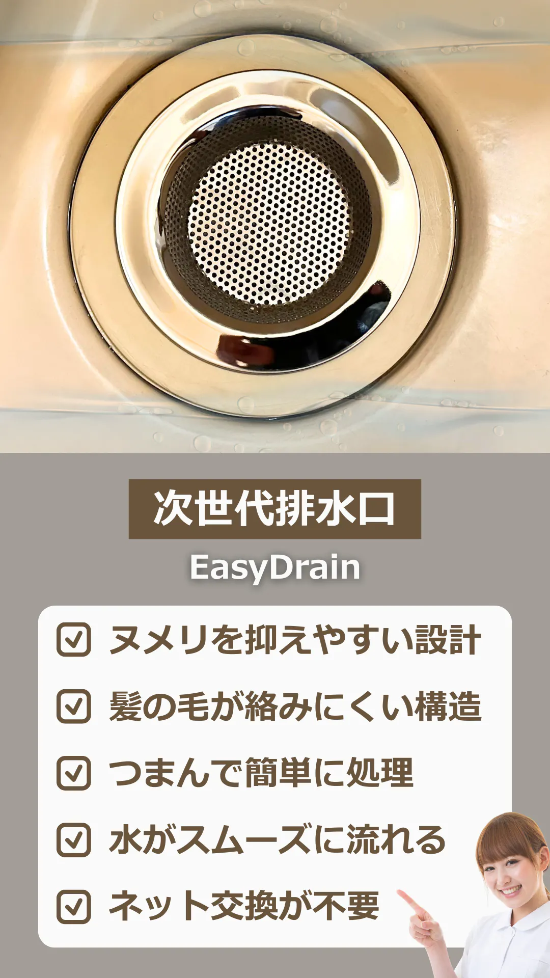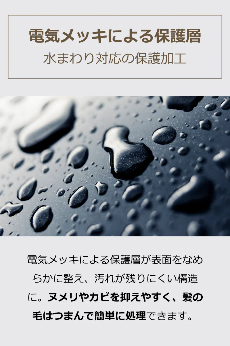 EasyDrainは、素材だけでなく“表面”に着目しました。電気メッキによる保護層が表面をなめらかに整え、汚れが付着しにくく、落としやすい状態へ導きます。