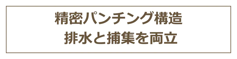 パンチング加工とは、金属板に均一な穴を開ける加工方法のこと。穴の大きさや配置を細かく設計することで、排水性とキャッチ力のバランスを整えています。