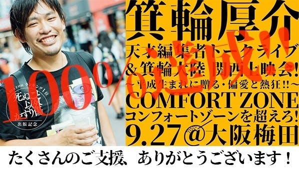 2018/09/22 07:308/28から初めておりましたこちらの企画。9/21の23:59をもって、クラウドファンディング終了となりました! 最終的に1,616,500円、241名のパトロン様のご支援をいただくことができ、大変感謝しております。 イベント当日までのこり5日!箕輪編集室 関西チーム一丸となって、ご支援いただいた皆様に楽しんでいただけるよう、気を引き締めて頑張ってまいります! なお、クラファンによる参加者の募集はこれにて締め切っておりますが、参加権のみの一般開放席もこちらでご案内しております。乗り遅れた方はぜひこちらからお申し込みください! ↓↓↓ 一般開放席のチケットページへ移動する もっと見る