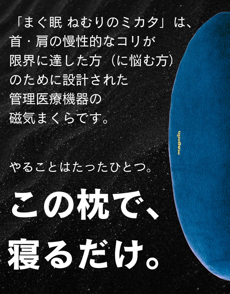 A:一番の違いは、「首だけ」ではなく「首から肩までを含めた寝姿勢全体」を前提に設計されている点です。磁気の配置と形状が、就寝中に首・肩まわりへ自然にアプローチするよう考えられているため、装着型の磁気ネックレスや、一般的な平面型磁気枕とは使用感が異なります。