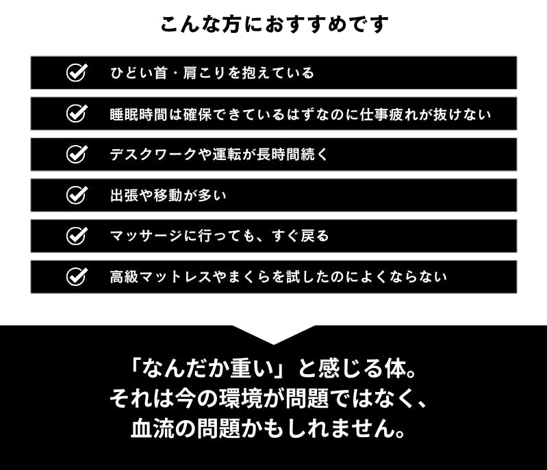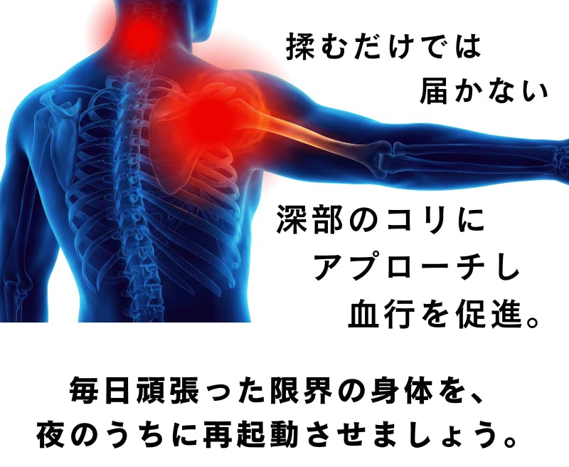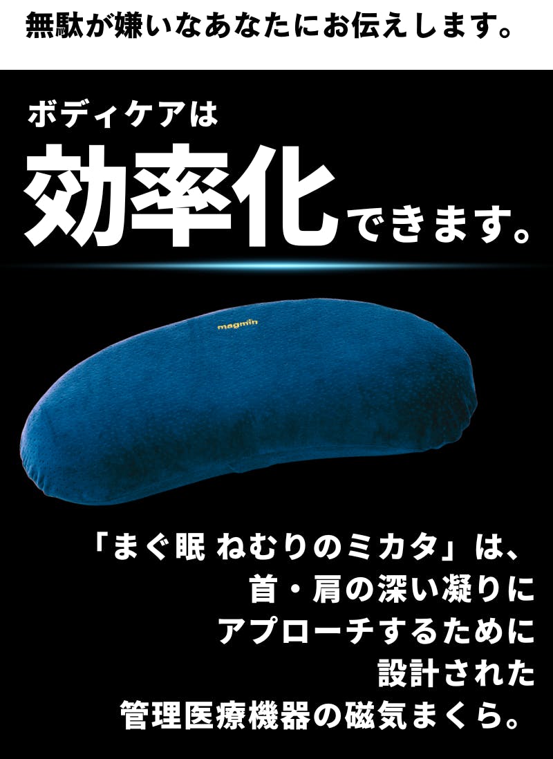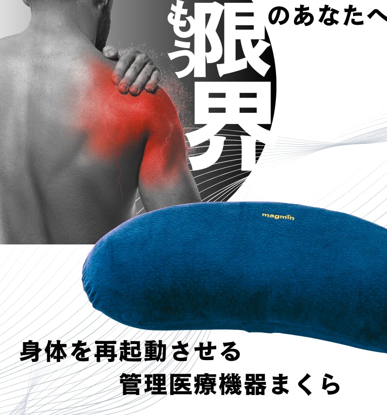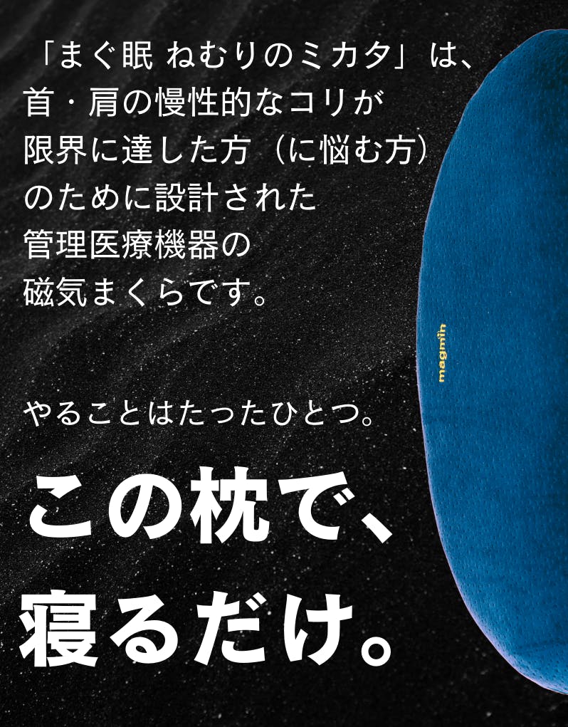 もう限界のあなたへ。血行を”再起動”せよ!身体を再起動させる管理医療機器まくら「まぐ眠 ねむりのミカタ」。仕事や移動で酷使する首・肩に、磁気の力で、巡りをサポート。首・肩のコリに働きかける磁気治療器です。整体に行く時間がなくても、自宅でも出張先でも、毎日の睡眠を無理なくケア時間に変えられます。