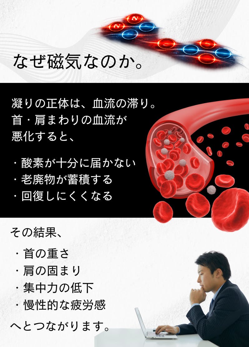 使用感や体感のタイミングには個人差があります。早い方では「首・肩の違和感が軽く感じる」「朝の重さが違う」と感じることもありますが、磁気による血行促進を目的とした製品のため、一定期間、継続して使用することを前提にお考えください(※感じ方には個人差があります)。