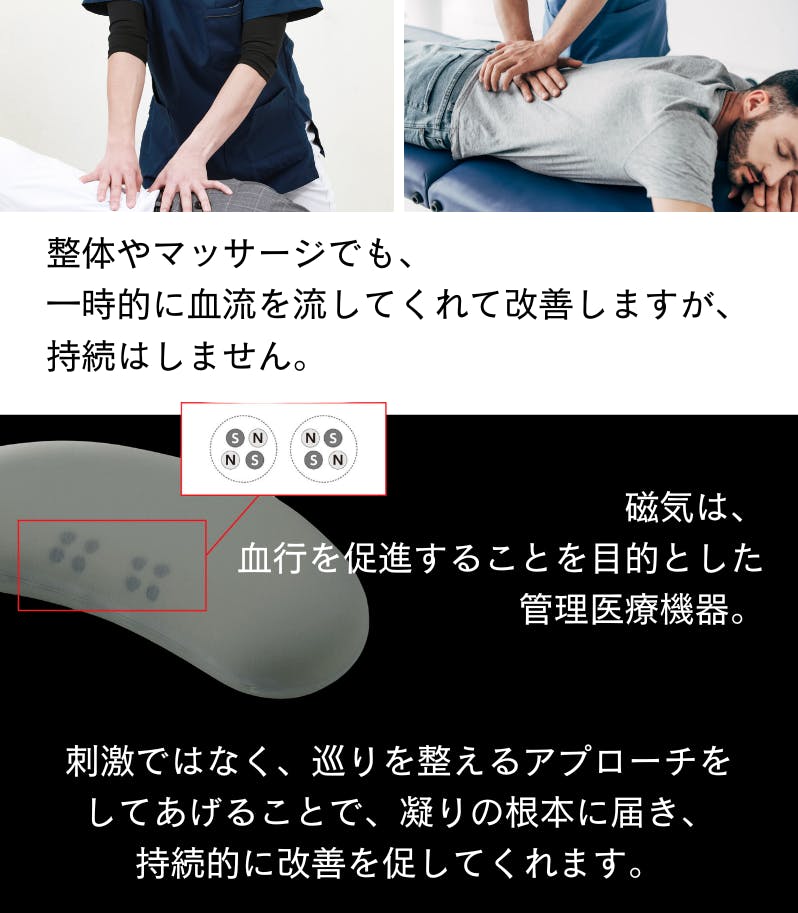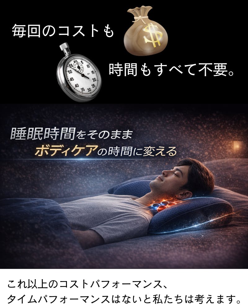 整体やマッサージは、その場でのケアとして有効です。一方、本製品は「睡眠時間を活用した継続ケア」を目的としています。通院や移動時間を必要とせず、毎晩使用できる点が大きな違いです。ライフスタイルや目的に応じて使い分けることをおすすめします。