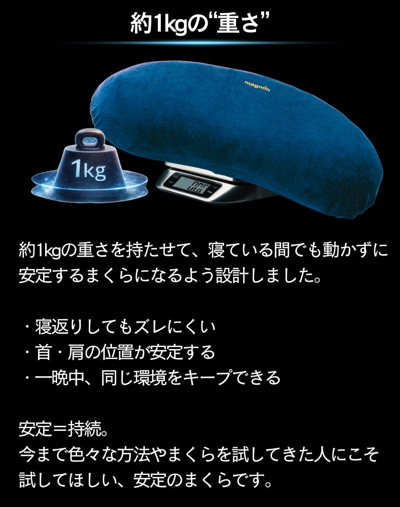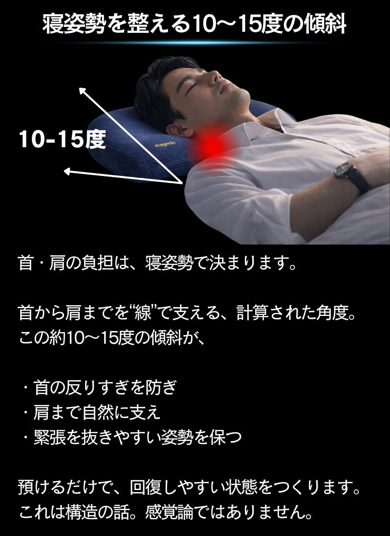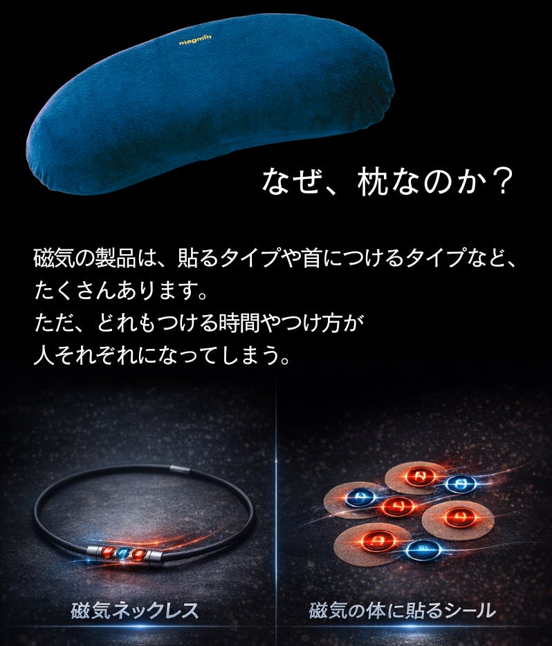 一番の違いは、「首だけ」ではなく「首から肩までを含めた寝姿勢全体」を前提に設計されている点です。磁気の配置と形状が、就寝中に首・肩まわりへ自然にアプローチするよう考えられているため、装着型の磁気ネックレスや、一般的な平面型磁気枕とは使用感が異なります。