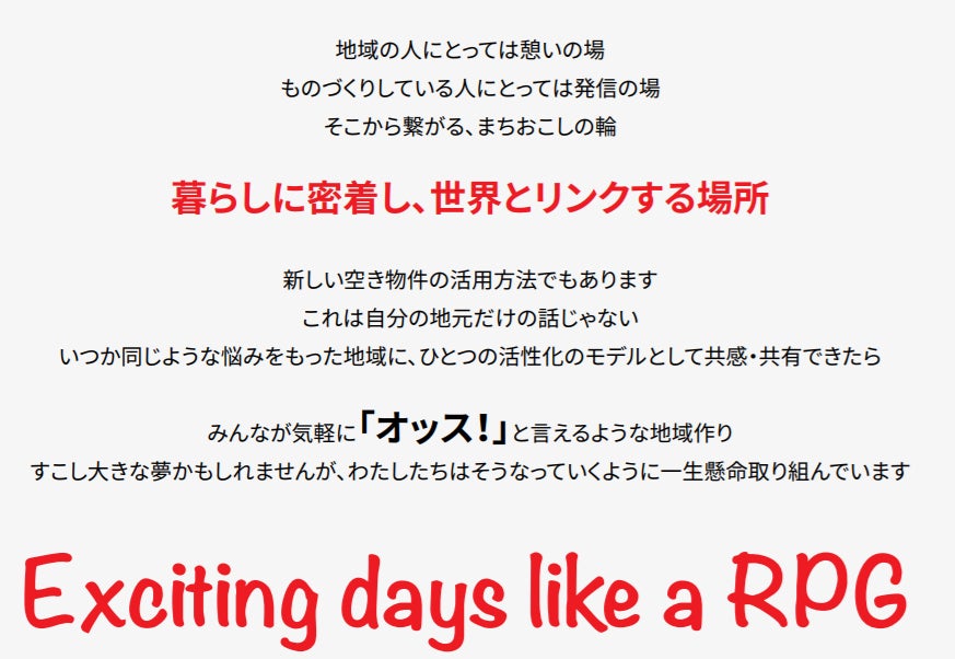 2018/10/19 17:19RPG, inc.の提案する可能性に満ちあふれたシェアスペース "SAVE AREA"計画 このプロジェクトを応援してくれる皆様からコメントを頂いております! 発信する人も、遊びに来る人も、素敵な交流が生まれる未来を夢みて、是非一緒に盛り上げて行けたら嬉しいです! 軌道に乗せるのは大変ですが、まずは、大きな根と大きな幹を作るためにゆっくりでもよいですから、前に進ませて継続してください。 葉や枝は折られてもなんとかなります。 【とこなび】様より Q:どんな活動をされているのですか?地元ところざわの店舗や企業、個人事業主の方たちを応援するポータルサイト「とこなび」の運営や、若者を支援する目的で「ところざわ学生映画祭」「キャリア教育シンポジウム」などのプロヂュースなどもしております。 Q:どんな方にむけて活動されていますか? 主に二つの方たちです。 ひとつは、「とこなび」に広告掲載を考えている、お店、企業、個人事業主の方たち。もう一つは、「とこなび」を使って、ランチやカフェなどお店を探している人、 その他、情報を得たいと思っているひと。サイト内で交流を求めている人など。 Q:この施設(SAVE AREA)で交差するアナタとワタシの未来予想図 ビジネスや遊び事、文化芸術などの創造には、様々な才能や知識が交差する“空間”や“場”のようなものが必要だと思っています。 そのような“場”がこの施設だとおもしろいと思っています。 Q:この施設(SAVE AREA)はどんな人にオススメできますか? 好奇心旺盛で、想像力と創造力に富んでいて、チャレンジングな人。 「とこなび」 https://tokorozawa-navi.com/ 所沢市東所沢3-22-5 04-2945-5880 代表 山下勝也 080-3010-3717 ★Reply from RPG, inc. コメントありがとうございます!地元から発信するメディアとしてたくさん勉強させて頂きます。人と場所と出来事とそれを広く伝える発信が必要不可欠だと感じています。この施設もそこまで見据えた動きができるように頑張っていきたいと思います。本当にまずは大きな幹となり、多くの人の拠り所になれるように頑張っていきたいと思います!もし成長したときは是非取材して下さい♪それと、とこなび様がプロデュースしている「ところざわ学生映画祭」なども、この施設でいつかサーキット上映できたらいいなぁと勝手に思っています。今後とも何卒よろしくお願いいたします! 「ところざわ学生映画祭」情報 ・11月25日(日)10:45(開場10:00)~・西武所沢店8階ワルツホール所沢・入場無料 RPG, inc.のクラウドファンディング本文はコチラ https://camp-fire.jp/projects/view/92732 多くのご支援をいただき本当にありがとうございます。10月20日がラストデイです! 正真正銘のラストスパート!ご支援頂いたみなさまの気持ちやお言葉、カラダとココロの奥まで染み込んでいます!「応援して良かった!」そう思える日まで、絶対に歩みを止めません。ここからの動き、ここからの活躍、しっかりと追いかけて頂けたら嬉しいです!見ていて下さい!一緒に巻き込まれて頂いた皆様、本当にありがとうございました!そして、ラストのラスト、一緒に飛び出す準備をして頂いているみなさま、まだ支援するか悩んでいる皆様、どうか、思い切ってご支援の程お願いいたします!必ずや面白い出来事が巻き起こります。そのとき「一緒に関わって始められた」という思い出に。一緒に仕掛ける側で楽しみましょう!待っています。どうか応援の程何卒よろしくお願いいたします! もっと見る