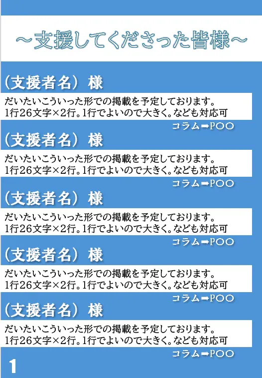 別冊自体は全ての支援者様にPDF送付を行う予定ですが、主に読まれる方はおそらく「おなじく高額支援を行った方」になり、その方にご自身の宣伝を読んでいただくことで、今後の同人活動の足掛かりとしていただける可能性があるものと私は考えています。