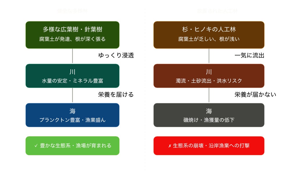 しかし放置された人工林では、腐葉土が育たず、雨水が土に染み込まずに一気に川へ流れ出します。栄養の乏しい水が海に届くことで、磯焼けや漁獲量の低下が各地で報告されています。