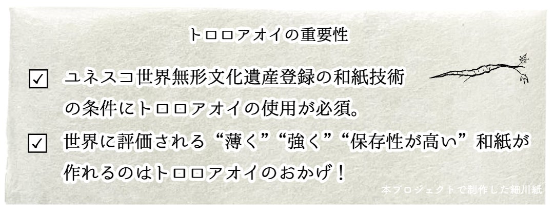 手漉き和紙技術は世界無形文化遺産に登録されており、その登録条件にトロロアオイを原料として使用するとされています。