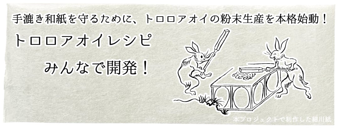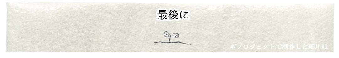 本プロジェクトはトロロアオイ生産組合会長黒沢さん、わしのねり参加メンバー、トロロアオイ生産組合、紙漉き職人さん、小川町役場、小川町の農家さん、小川町の飲食店さん、水上製本所、氷風穴の里保存会さん、全国の和紙の産地さん、神社さん、企画屋かざあなメンバーをはじめ、たくさんの方々に支えていただき、起ち上げて5年間プロジェクトを運営することができました。