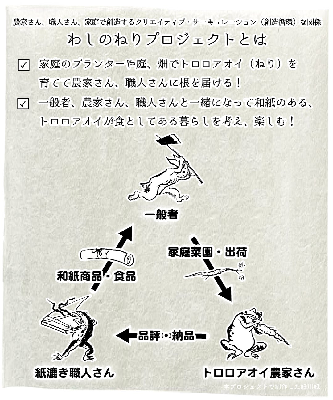 わしのねりは6年目に突入し、農家さん、紙漉き職人さん、消費者がつながる伝統工芸のこれからの新モデルとなり、自然をとりこむ同化感覚を持つ日本だからできる持続可能な社会に向けて、関わる方のインスピレーションを刺激し合えるクリエイティブ・サーキュレーション(創造循環)といった新しい循環の仕組みづくりに向けて確実に歩んでいます。