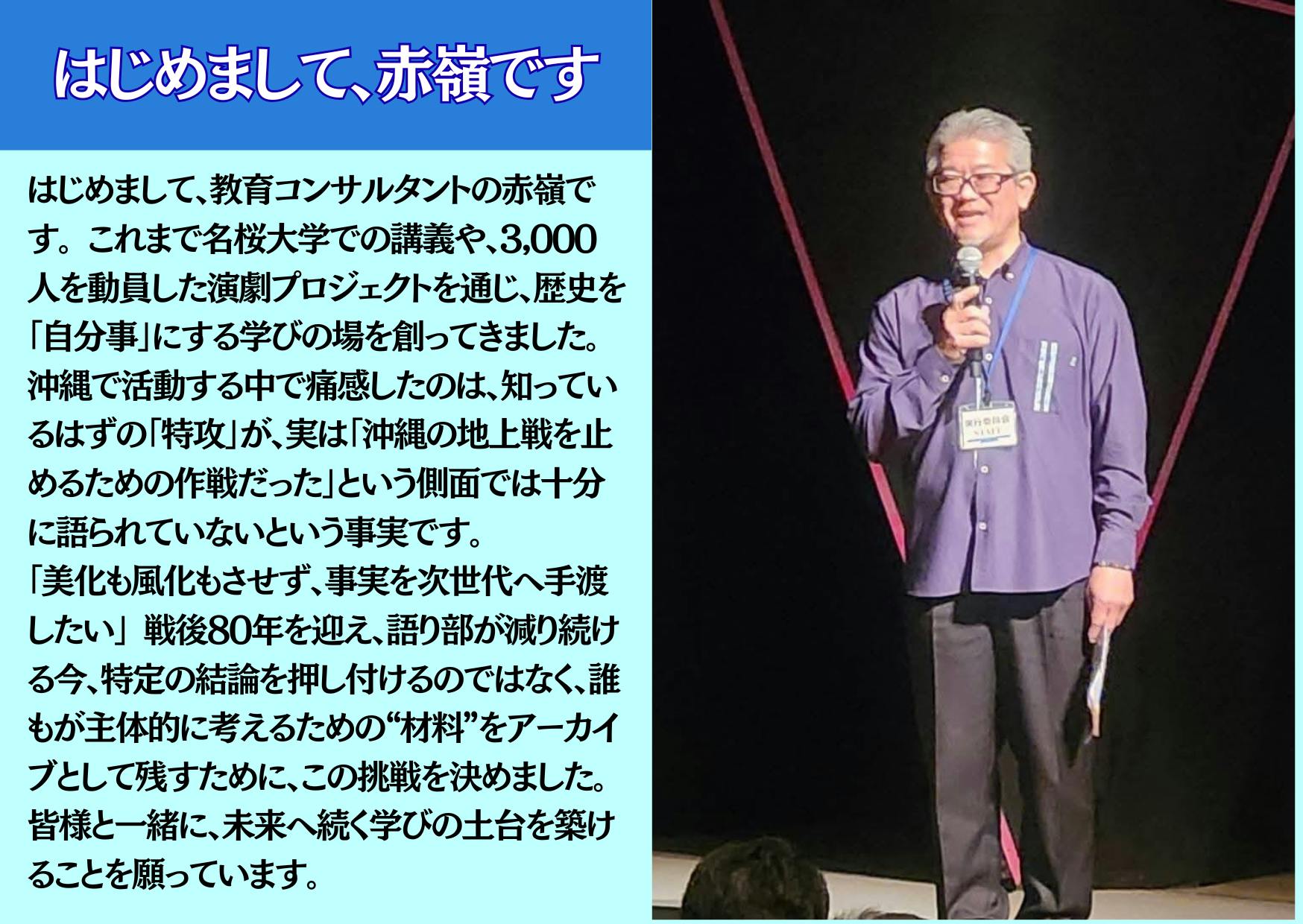 私は教育コンサルタントとして、これまで3,000人以上の方に演劇や講演を通じて歴史を伝えてきました。その中で感じたのは、「知らないままになっていること」が、考える機会そのものを奪っているという危機感です。