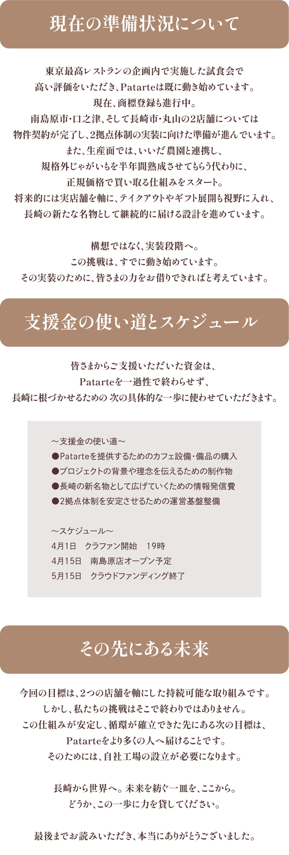 2026/04/02 08:42初日からたくさんのご支援、本当にありがとうございます!クラウドファンディング初日。初めての挑戦で、とても緊張していたのですが、初日から皆さまの暖かいご支援をいただき、ありがたい気持ちと合わせて、これからの事業の大切さを改めて強く実感しています。スタッフ一同、身が引き締まる思いです。今後は、加工体制の整備やECサイトの構築を進め、より多くの方に届けていきたいと考えています。そのため、ネクストゴールを設定し、引き続き挑戦を続けていきます。また、これからは新店舗の様子なども、随時お届けしていきます。改めまして、この度は温かいご支援をいただき、誠にありがとうございました。引き続き、応援いただけますと幸いです。 もっと見る