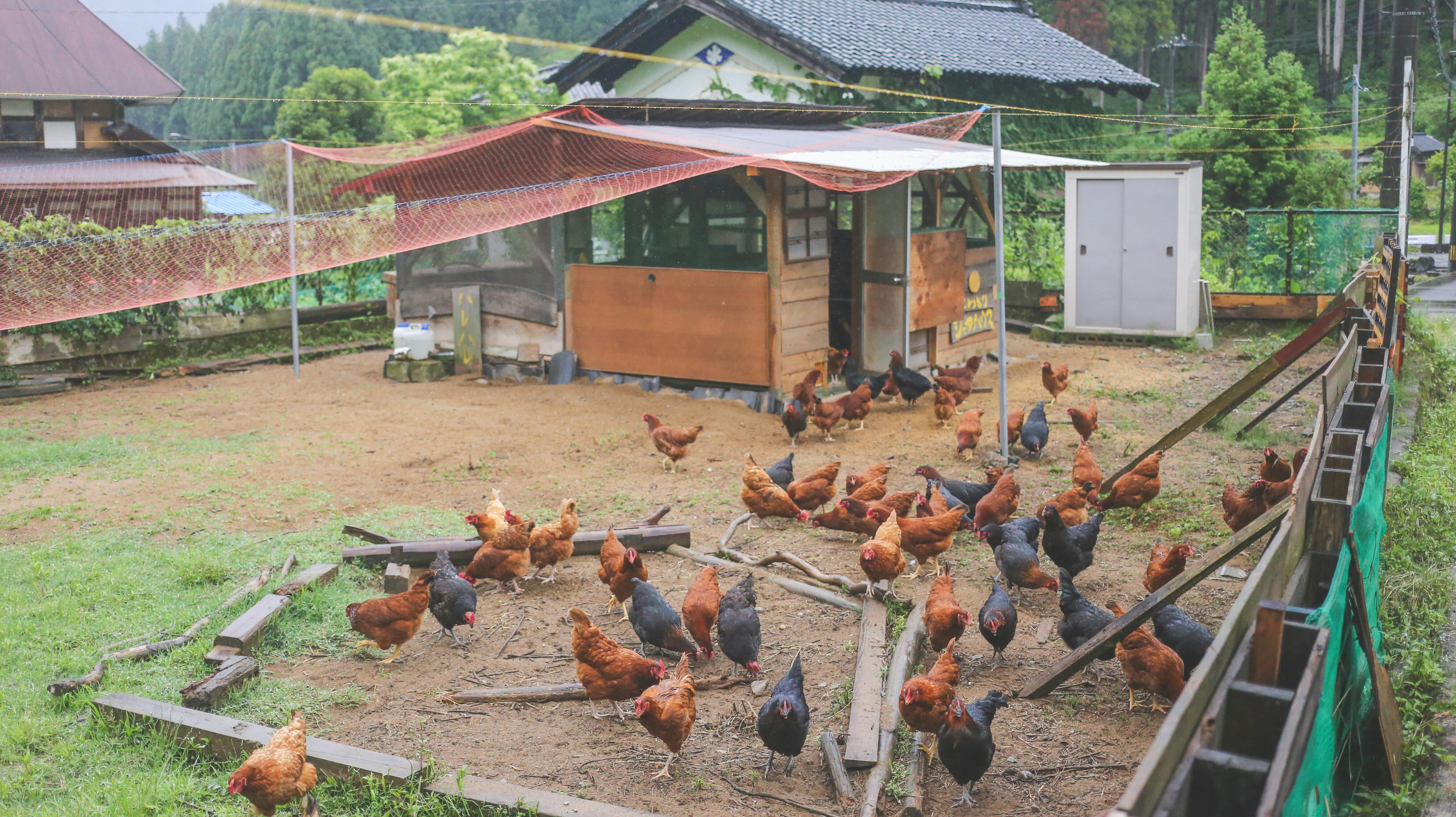 里山くらし舎の縁側からは、放し飼いの鶏たちを一望できます。