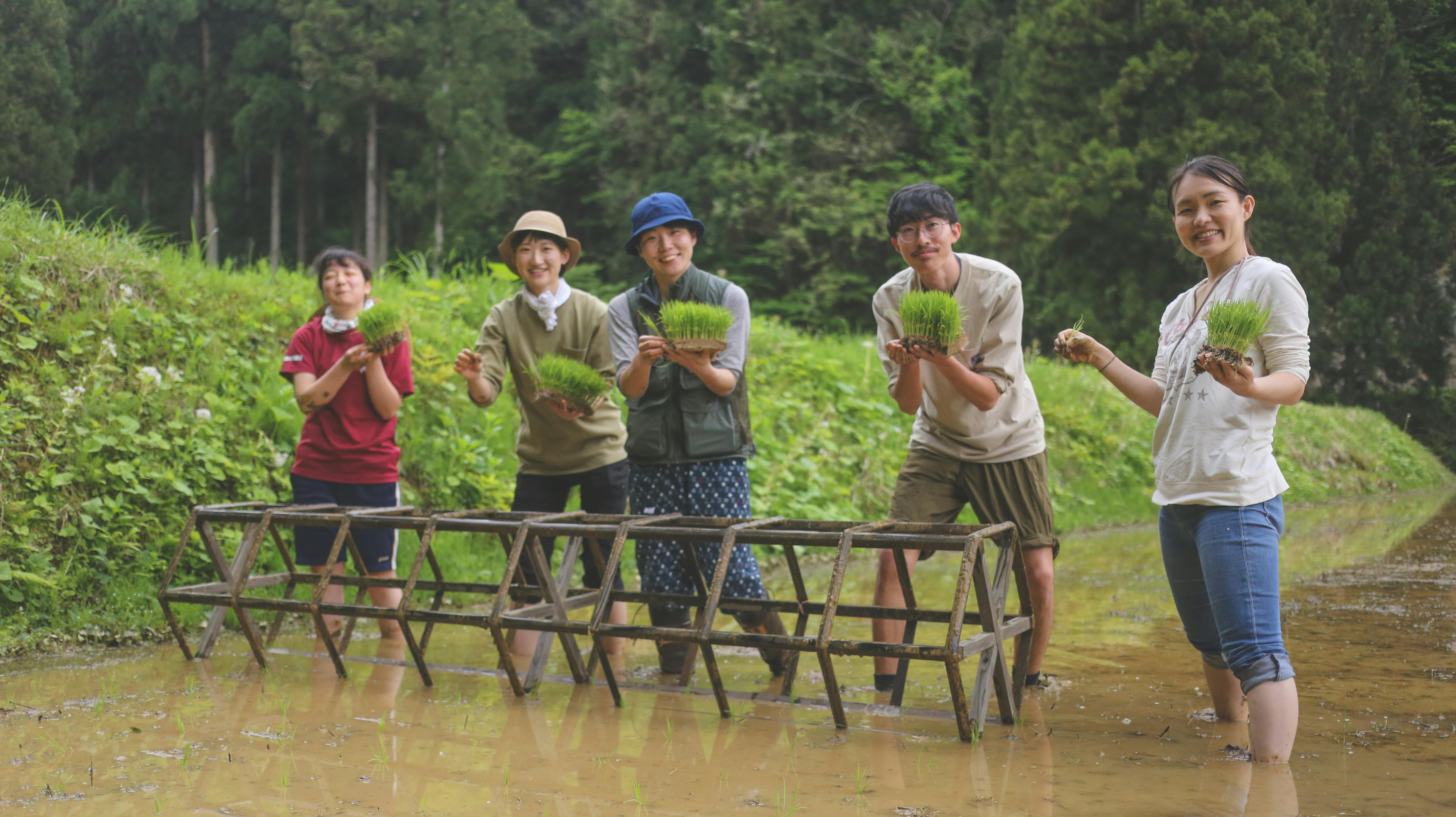 春は、手で田植えをし、冷たい水に足を入れ、泥んこになりながらみんなで一本ずつ苗を植えています。