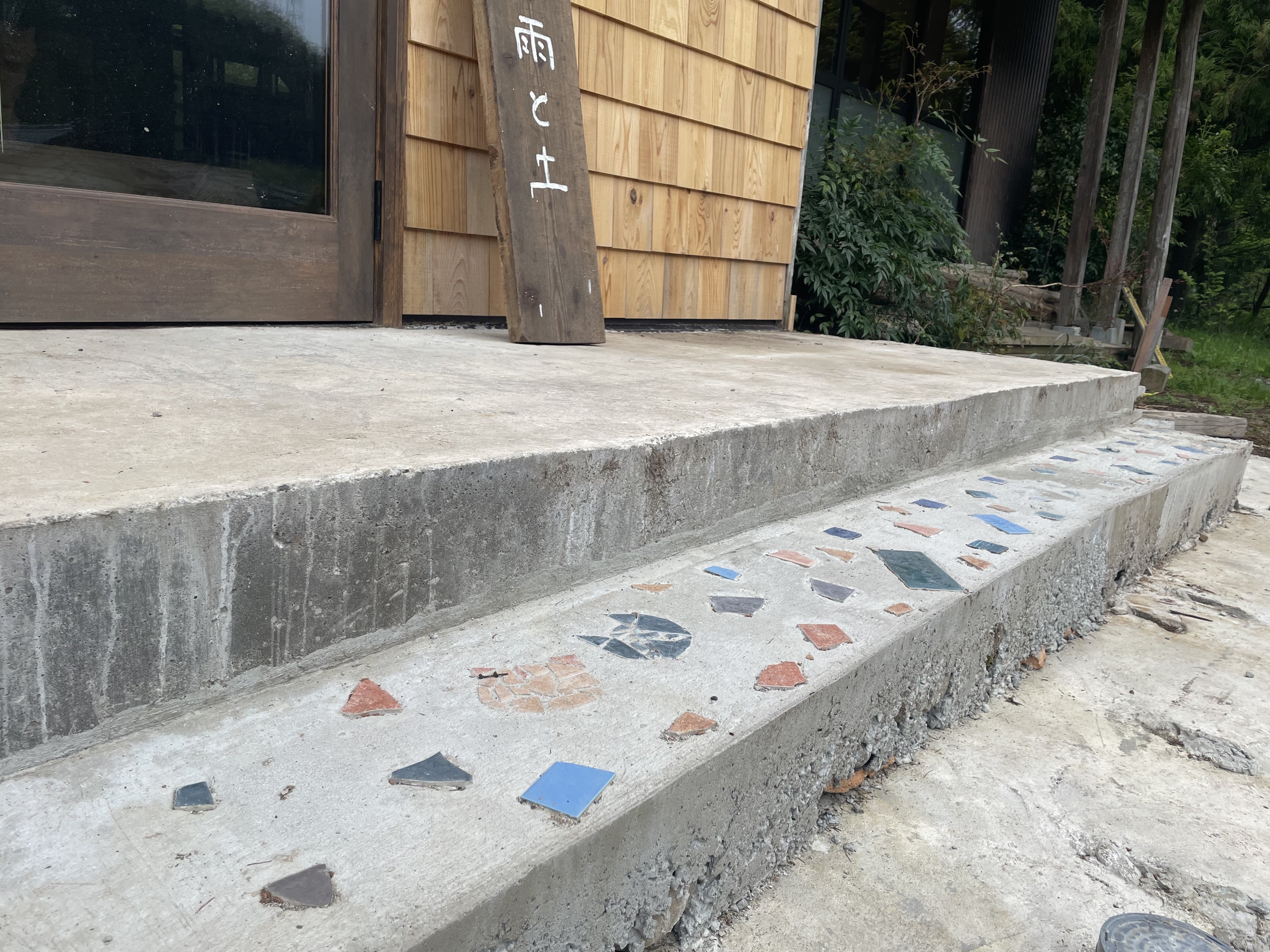里山くらし舎の玄関外に階段を作りました。手で練り上げたコンクリートを型枠に流し込み、最後にタイルを表面にはって仕上げました。