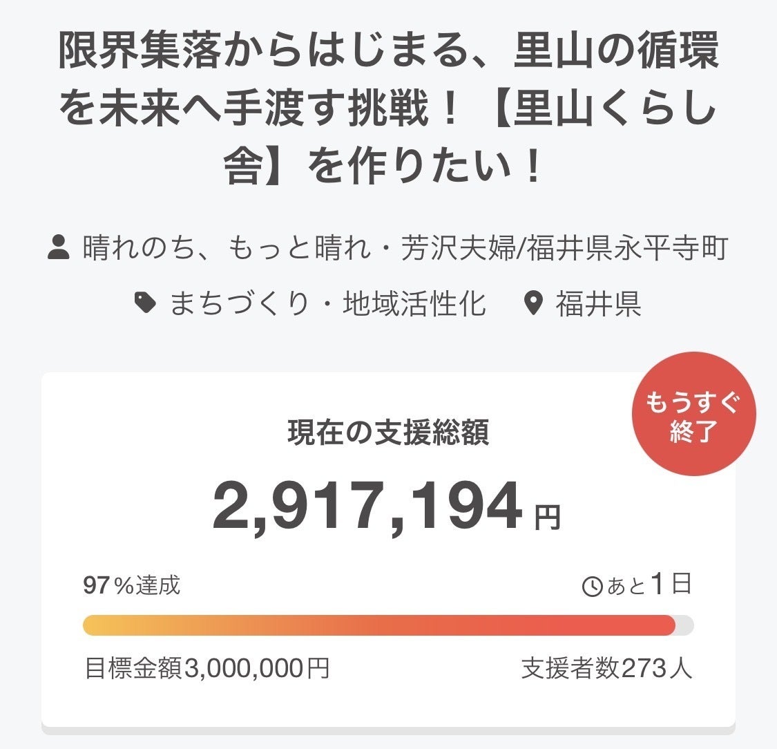 クラファン終了まで残り1日と3時間。達成まであと9万円のところまでやってきました。