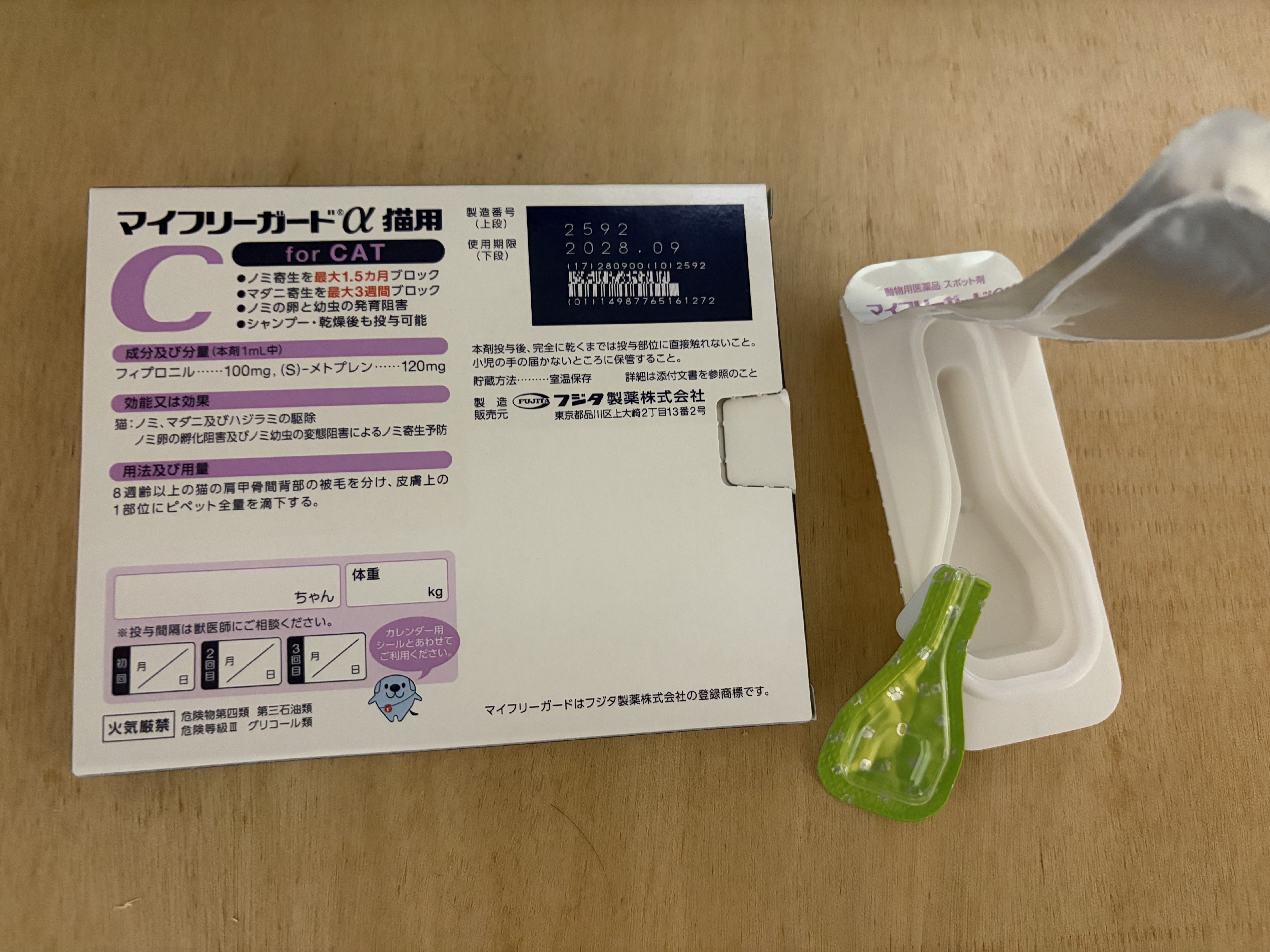 動物用医薬品(ノミ・マダニ・ハジラミ駆除剤)「マイフリーガード」を使用しました。
