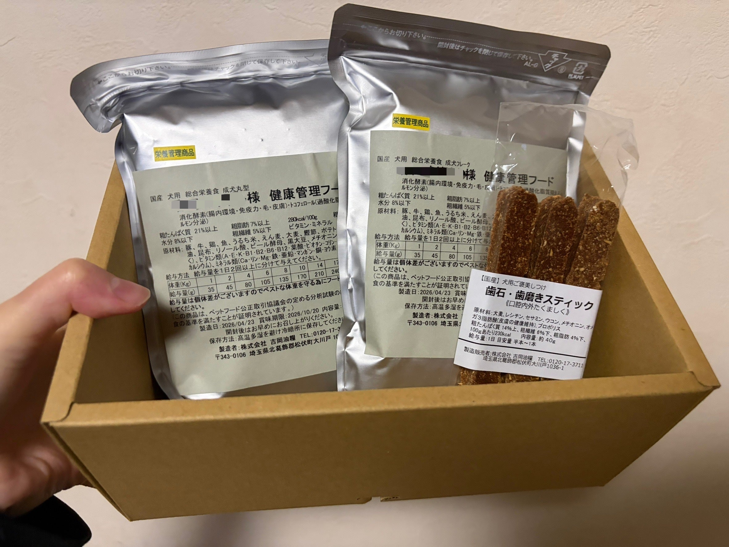 健康フード2点と、歯石・歯磨きスティック1点を頂き、保護犬さんたちの健康維持に大変役立てさせていただきます。