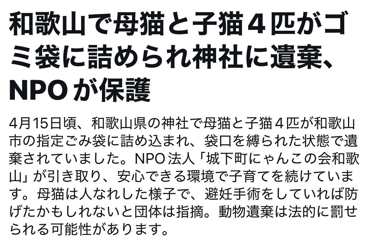 2026/04/17 20:30命を大切にしましょう。和歌山で、母猫と子猫4匹がビニール袋に入れられたまま遺棄されていました。袋の口は縛られ、そのまま放置されていた命たち。ほんの少し発見が遅れていたら助からなかったかもしれません。動物も同じ「命」です。苦しみも恐怖も感じています。どうか、捨てるのではなく守る選択を。このような悲しい出来事をこれ以上増やさないために、皆さまのご支援をお願いいたします。ーーーーーーーーーーーーーーーーーーーー もっと見る