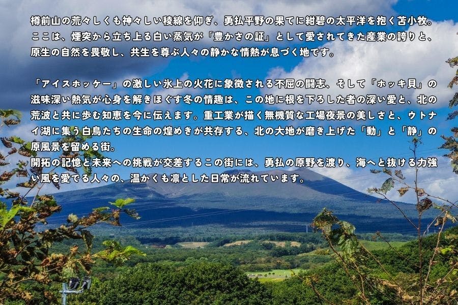 樽前山と太平洋が交差する躍動の街・苫小牧。雄大な活火山の山容を仰ぐ風景と、勇払平野の豊かな自然、そして力強い工業港の営みが息づく北海道苫小牧市。「ウトナイ湖」をはじめとする類稀な生態系と、北の海が育む滋味深い食文化は、多くの人々を魅了しています。