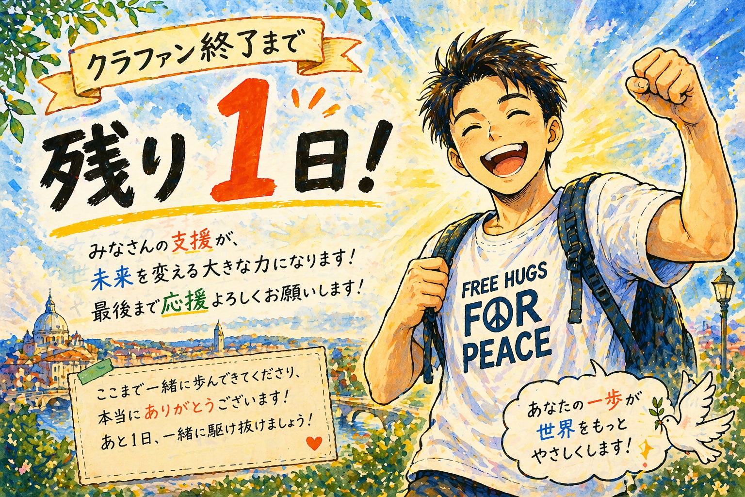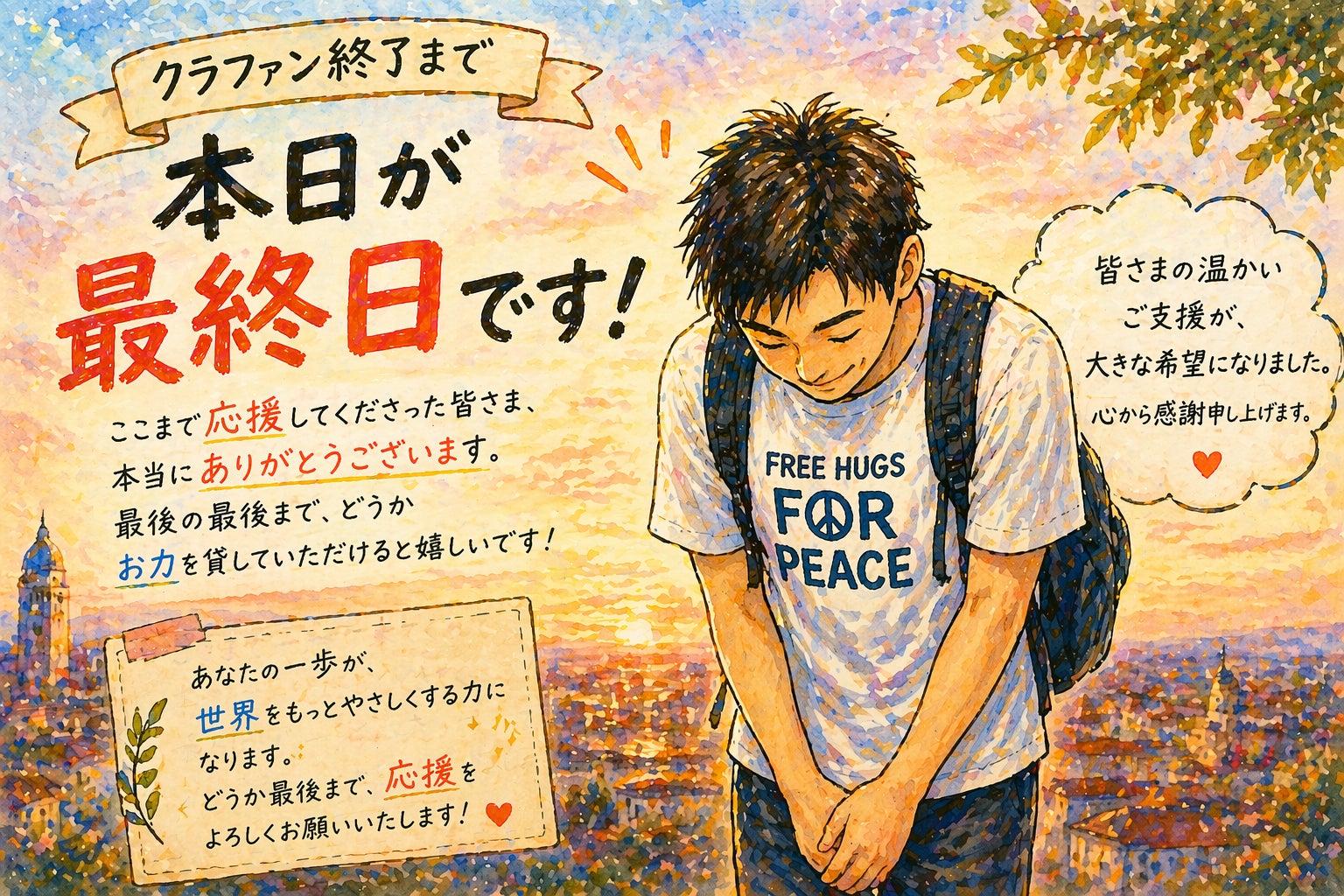 2026/04/29 21:07皆さま、本当に、本当にありがとうございます。15年以上続けてきた「Free Hug」の活動。44カ国を巡り、多くの人と抱き合ってきた中で、僕が見てきた「世界の温かさ」を形にしたい。その一心で走り続けてきたこのプロジェクトも、ついに残り24時間となりました。現在の状況: 支援金額:8,194,483円支援者数:1,254名目標の1,000万円まで、あと約180万円。ここまで来られたのは、紛れもなく今これを読んでいる「あなた」のおかげです。正直に言えば、不安で眠れない夜もありました。でも、1,200人を超える支援者の皆さまの名前を見るたびに、「一人じゃないんだ」と勇気をもらってきました。このプロジェクトは、僕一人のものではありません。応援してくださる皆さんと一緒に作り上げる、平和への、そして挑戦への物語です。明日、この挑戦が終わる時。皆さんと「やったぞ!」と笑い合いたい。最後のお願いです。あと少しだけ、僕に力を貸してください。あなたのシェアが、あなたの一押しが、奇跡への最後の一段になります。【僕たちの旅の結末を、その目で確かめてください】▶︎ https://camp-fire.jp/projects/927549/view/一緒に最高のエンディングを迎えましょう! もっと見る