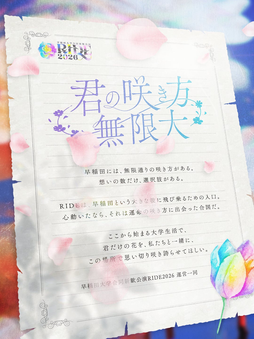 早稲田には、無限通りの咲き方があり、想いの数だけ、選択肢があります。心が動いたなら、それは運命の咲き方に出会った合図です。RIDEは、早稲田という大きな波に飛び乗るための入り口です。
